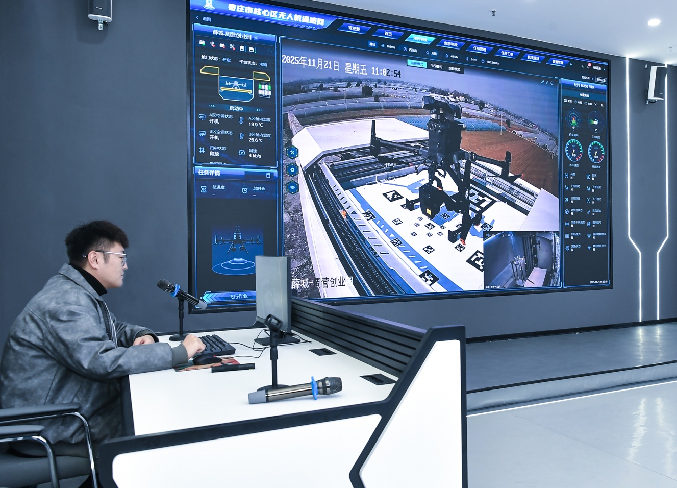 11月11日16时52分,一架无人机正沿着设定航线巡检,通过红外摄像头把疑似焚烧垃圾的画面实时传回薛城区低空无人机遥感网指挥中心——这是薛城区无人机遥感网项目的日常作业。