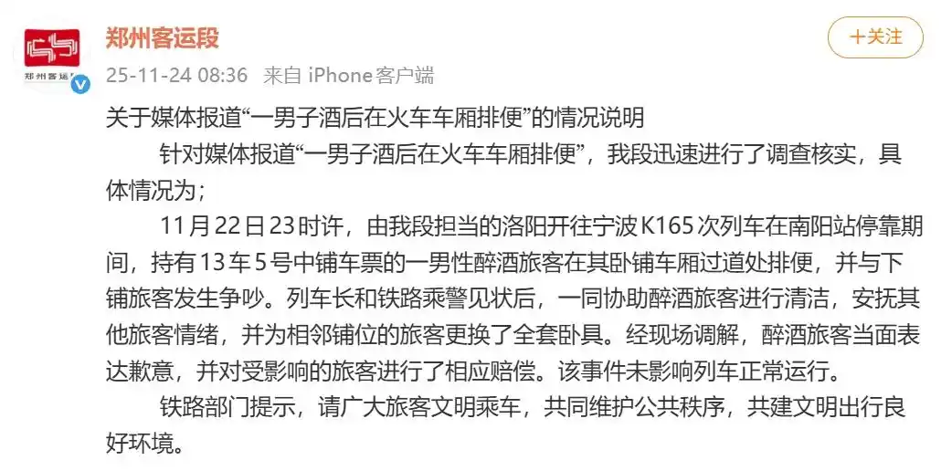 11月24日,郑州铁路局郑州客运段官方微博发布《关于媒体报道“一男子酒后在火车车厢排便”的情况说明》,内容如下: