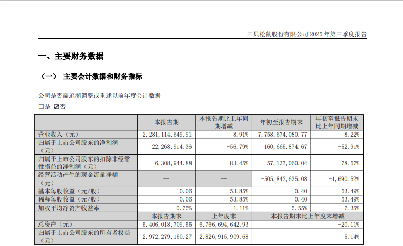 财务报告显示,今年前三季度,三只松鼠实现营业收入77.59亿元,同比增长8.22%,实现归属于上市公司股东的净利润为1.61亿元,同比下降52.91%。