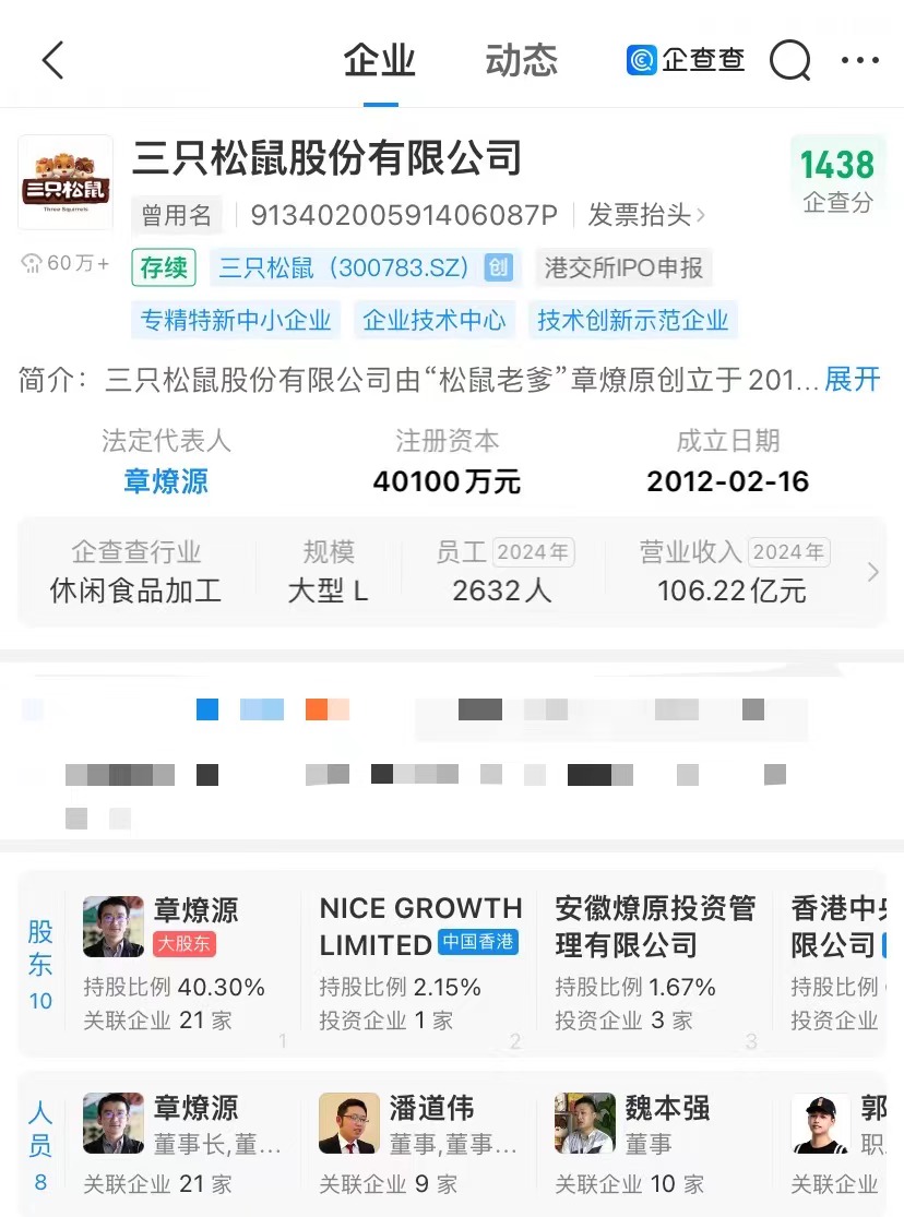 企查查APP显示,三只松鼠股份有限公司成立于2012年2月,法定代表人为章燎源,注册资本约4亿元,由章燎源、NICE GROWTH LIMITED、安徽燎原投资管理有限公司等共同持股。章燎源为公司创始人,并担任董事长、总经理、董事职务,在公司中叫松鼠老爹。企查查显示,三只松鼠已申请注册多个松鼠老爹商标,国际分类包括医药、服装鞋帽等。
