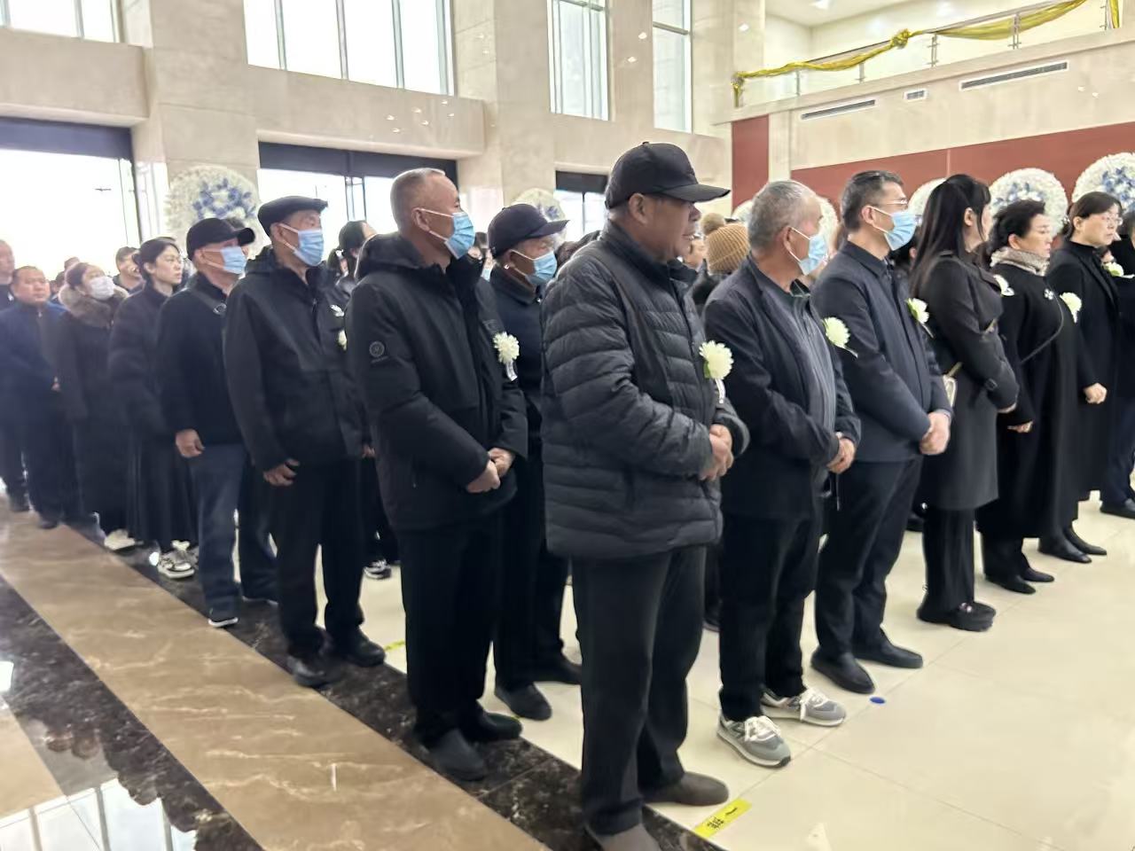 清晨的潍坊市殡仪馆,肃穆安静。馆外,前来参加送别仪式的人默默在胸前戴上白花,排队等待进入灵堂。馆内,张军桥的家人泪流满面,互相搀扶走入灵堂,张军桥的弟弟上前仔细整理骨灰盒。花圈簇拥着“援鄂援非,仁心化桥连中外;救心救溺,大爱如军振古今”的挽联。