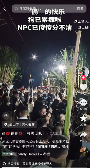 剥开“偷甘蔗”的外壳,实则是一场从“偶然发起”到“全民参与”的集体游戏。起初只是甘蔗地老板的灵光一现,随着在互联网持续发酵,游客从四方涌来,周边大学生主动加入NPC队伍,村民也纷纷赶来协助,当地相关部门更是介入维持秩序,保障游客安全。