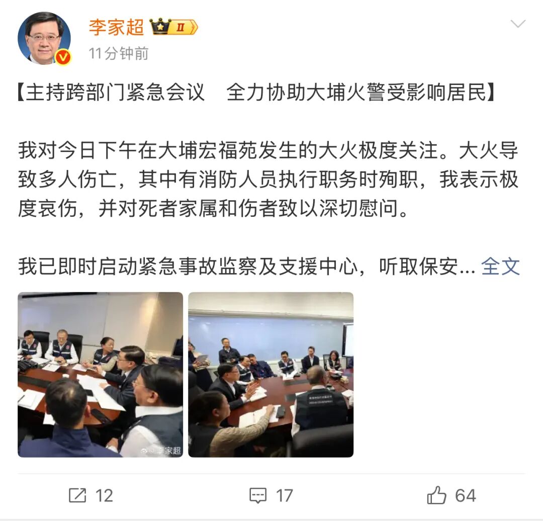 香港特区行政长官李家超表示,他对今日下午在大埔宏福苑发生的大火极度关注。大火导致多人伤亡,其中有消防人员执行职务时殉职,他表示极度哀伤,并对死者家属和伤者致以深切慰问。