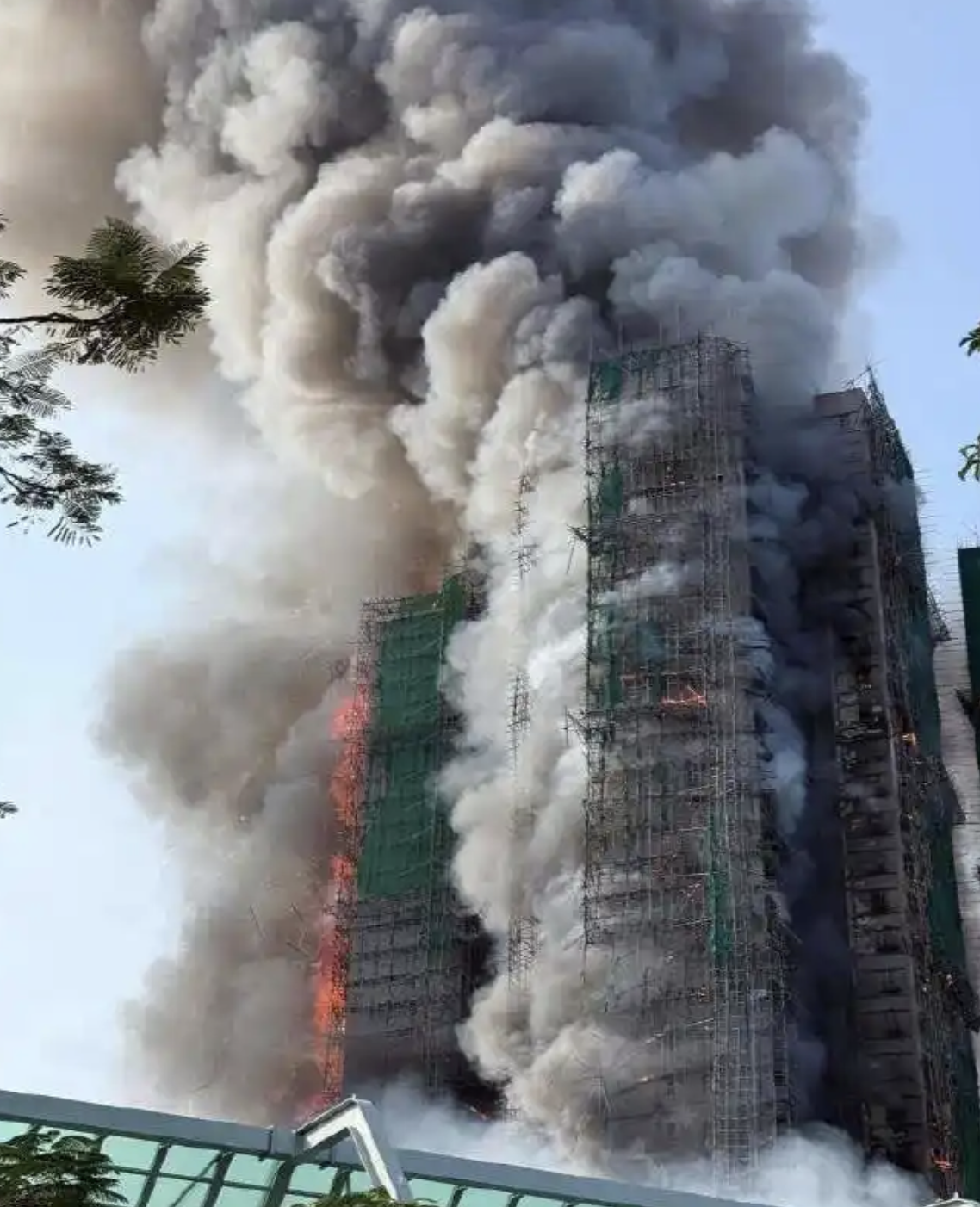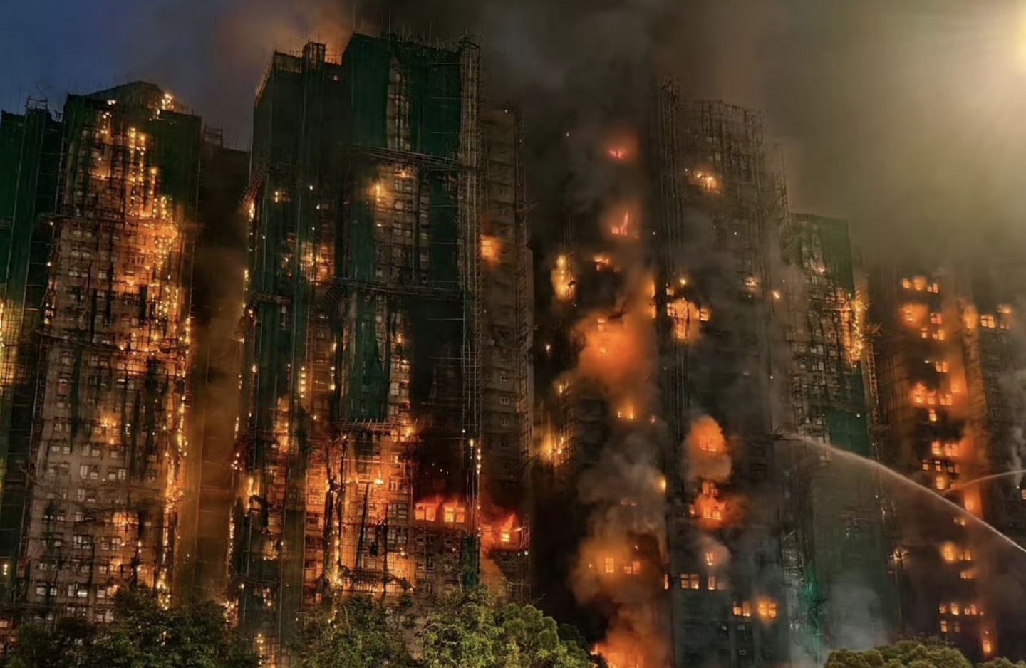 公开视频画面显示,香港大埔宏福苑宏昌阁外墙棚架燃起大火,火势达数层楼高,浓烟席卷半空,部分建筑材料掉落,楼内部分住宅单位内更有火焰喷出窗外。现场不时传出爆炸声,附近部分建筑已受波及,情况危急。