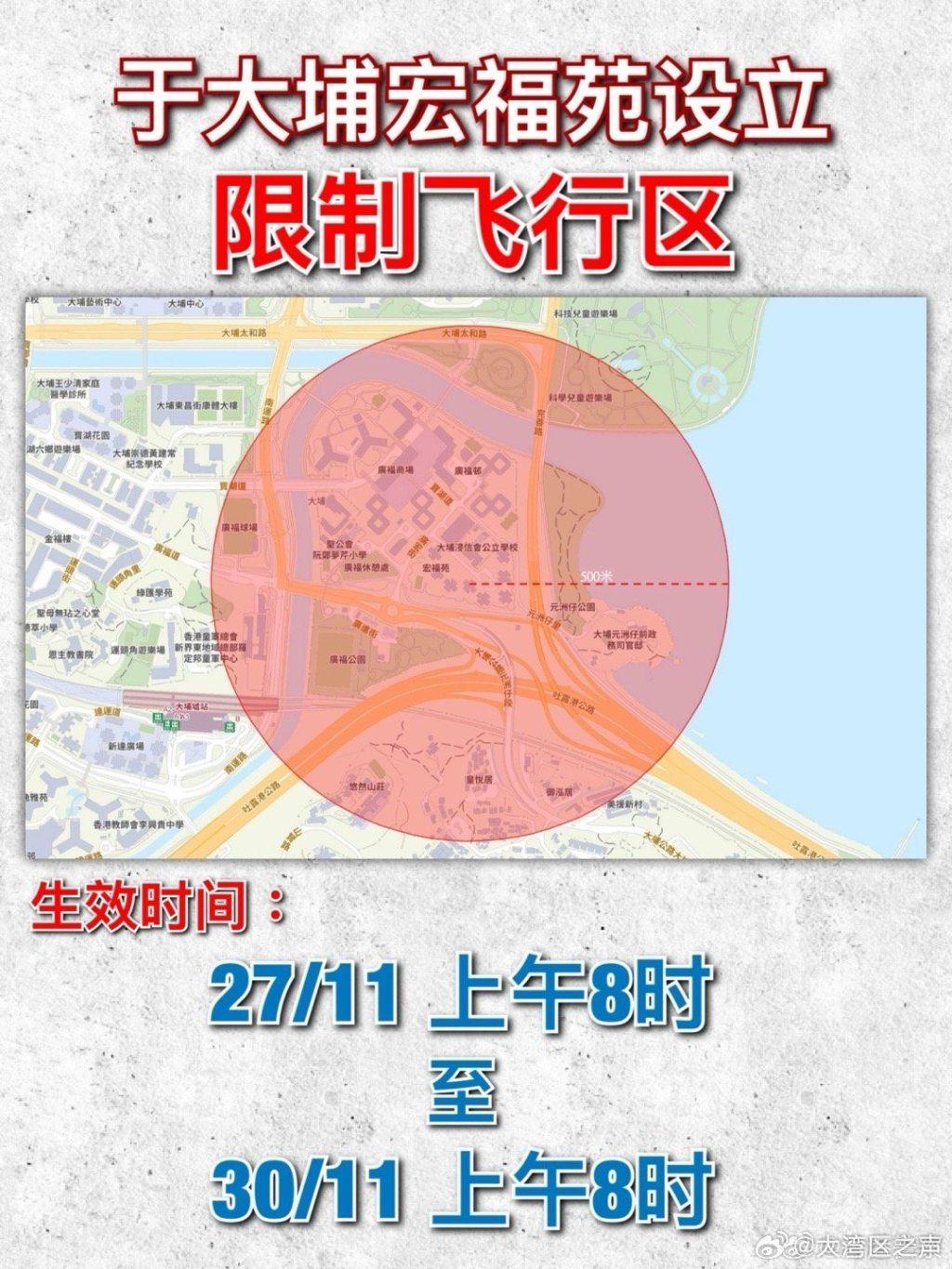就香港大埔宏福苑发生的五级火警,为保障公众安全及确保救援工作进行,香港警务处将于该范围设立“限制飞行区”。时间为2025年11月27日上午8时至2025年11月30日上午8时。(@大湾区之声)