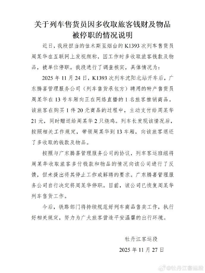 11月27日,牡丹江客运段发布“关于列车售货员因多收取旅客钱财及物品被停职”的情况说明: