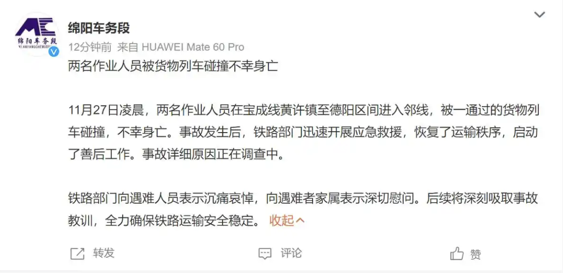 四川省成都铁路局绵阳车务段官方微博@绵阳车务段11月27日发布两名作业人员被货物列车碰撞不幸身亡情况通报: