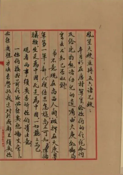 “凤笙大嫂并转五六诸兄嫂:弟不意现在尚留人间,被押在大庾粤军第一军军部,以后结果怎样,尚不可知,弟准备牺牲,生是为中国,死是为中国,一切听之而已。”