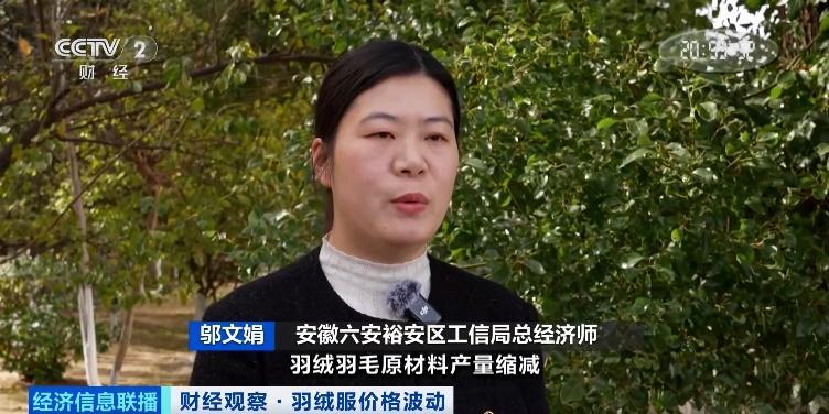 安徽六安裕安区工信局总经济师 邬文娟:家禽销量减少,羽绒羽毛原料产量缩减,加之寒潮影响,羽绒羽毛制品需求上涨,多重因素叠加导致羽绒价格上浮。