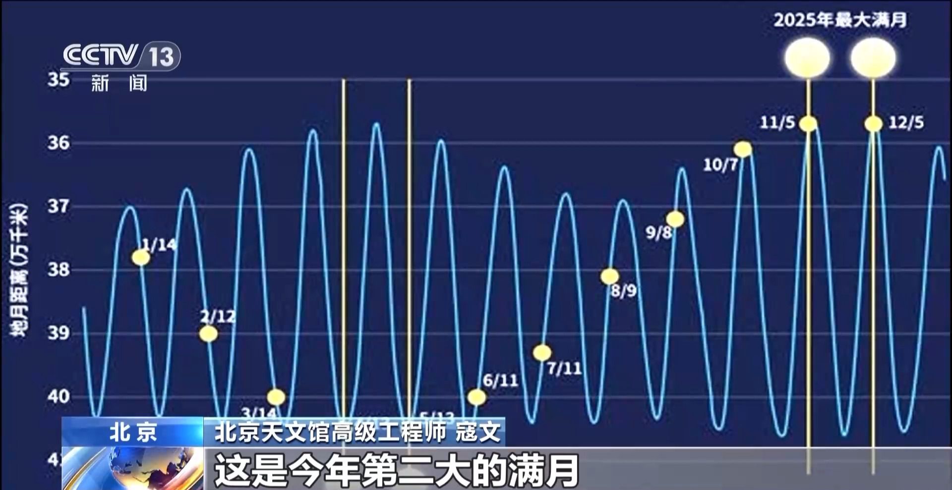 北京天文馆高级工程师 寇文:12月5日大约早晨7点14分是满月,而月亮过近地点的时间是在这之前大约12个小时,这是今年第二大的满月,也可以算是一次“超级月亮”。