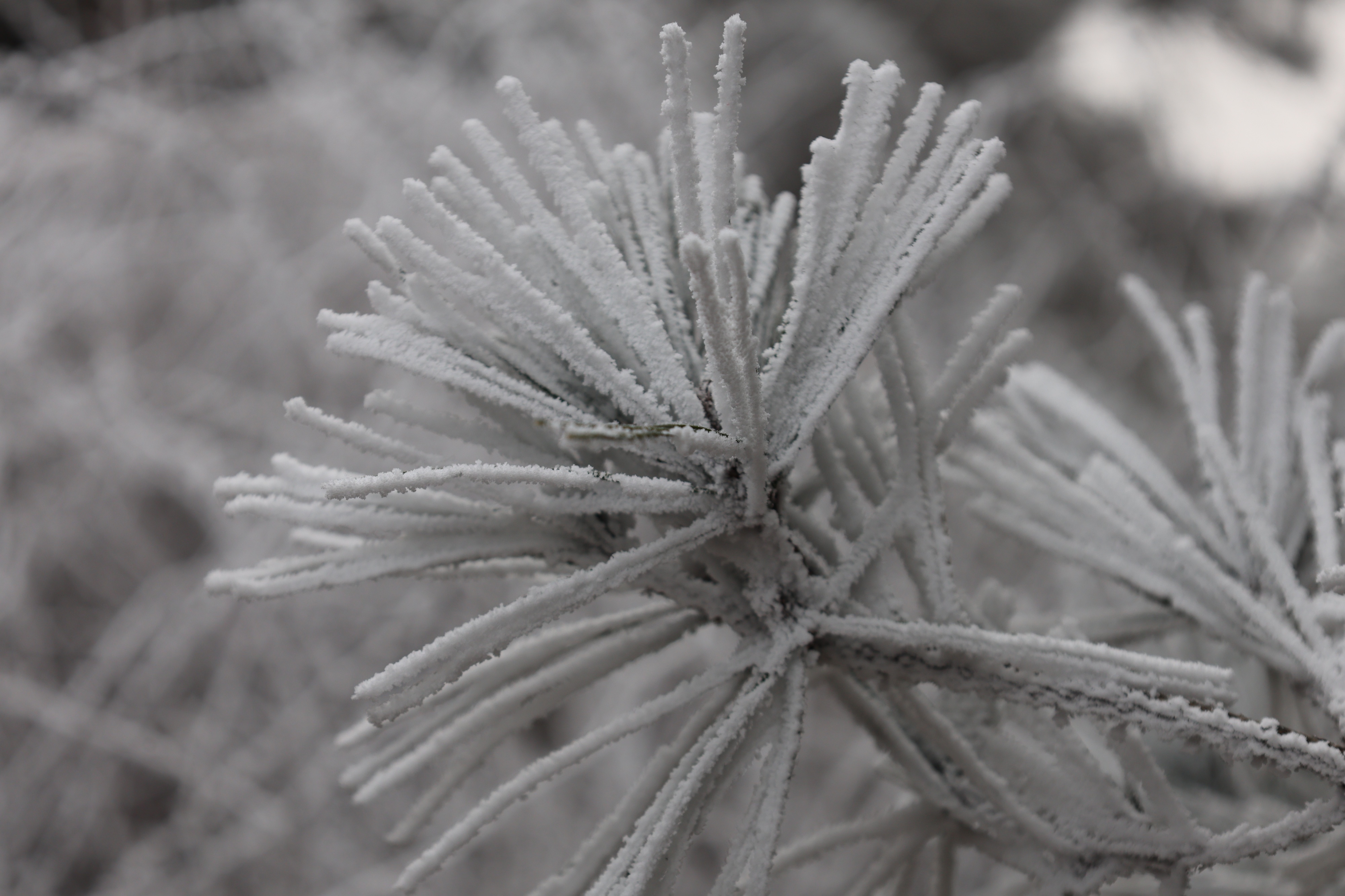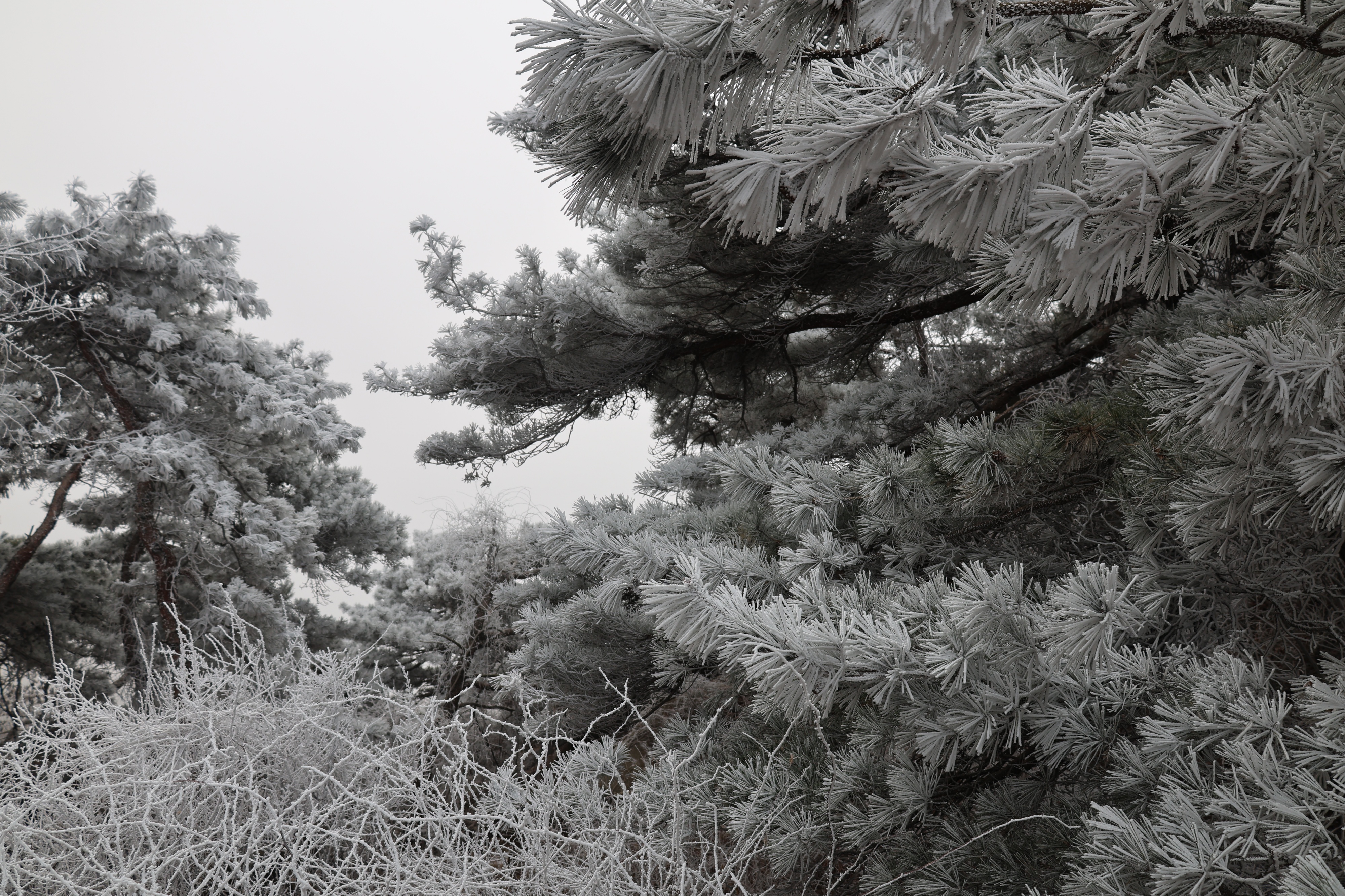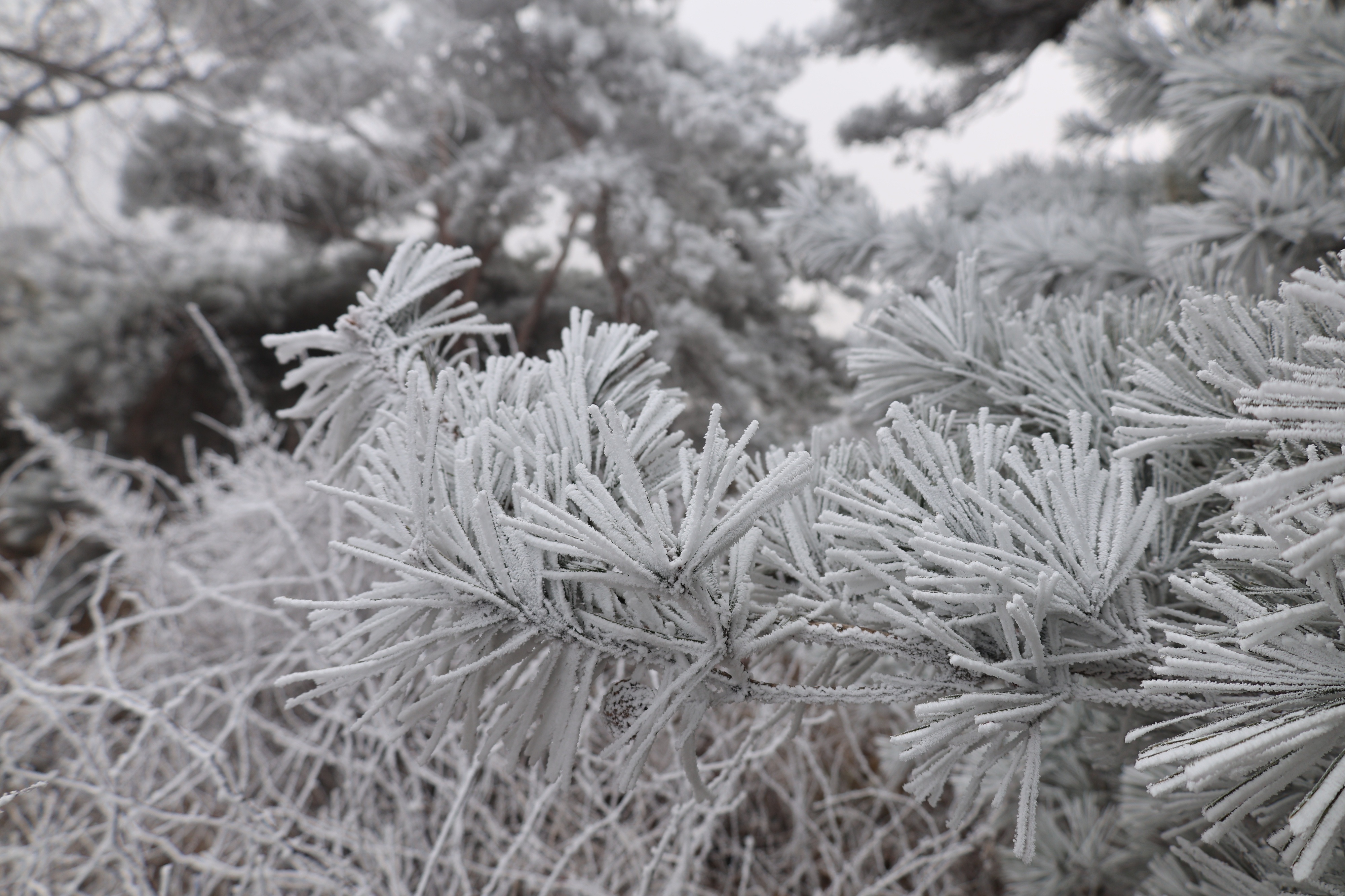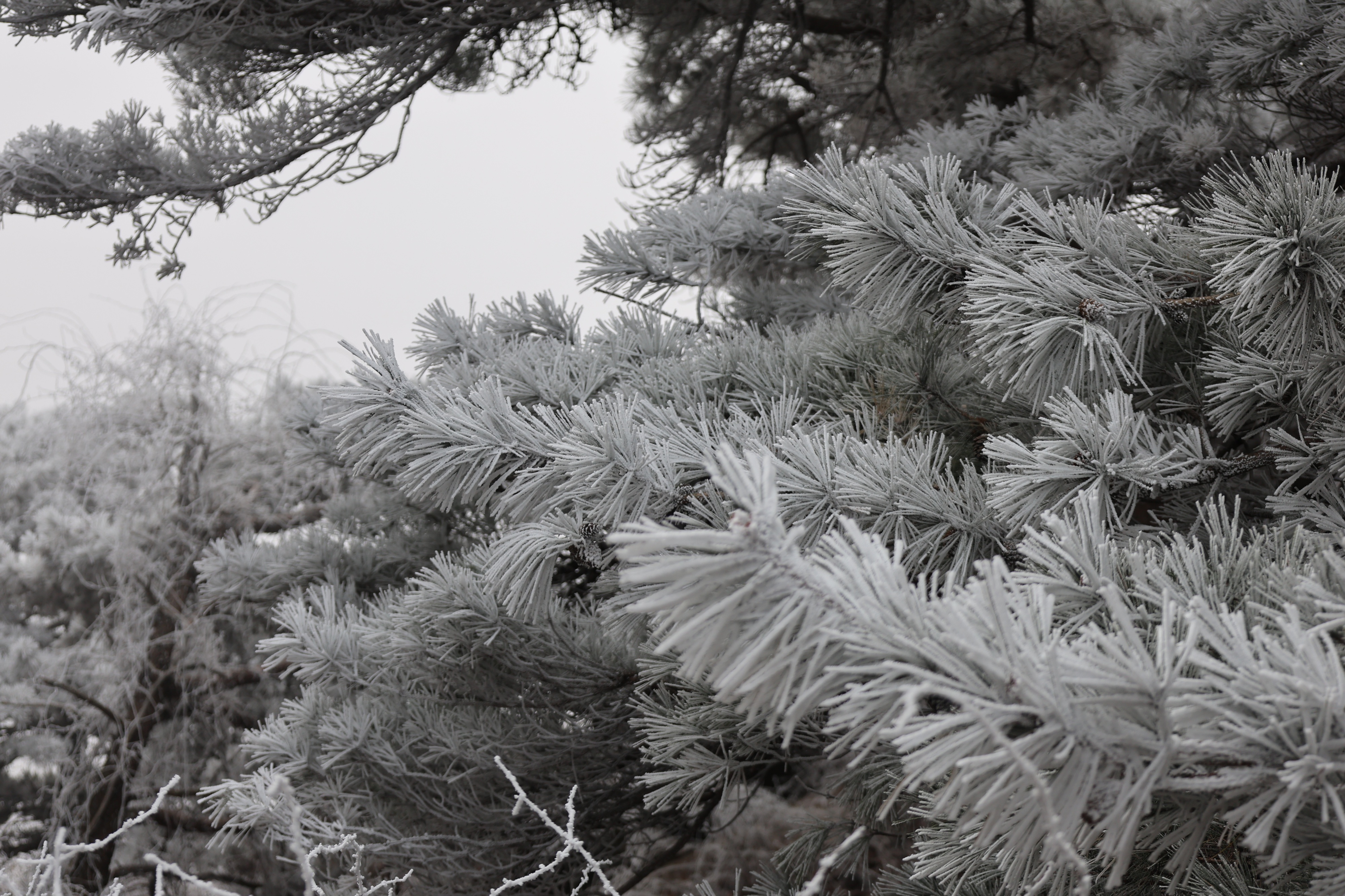 虽然不是大量降雪,但空气中过于饱和的水汽遇冷凝华,形成了非冰非雪的自然奇观。从山下到山顶,层层叠叠的雾凇交织成一幅无与伦比的冬日画卷,树木枝头结着霜花,冰晶闪闪,宛如童话世界。