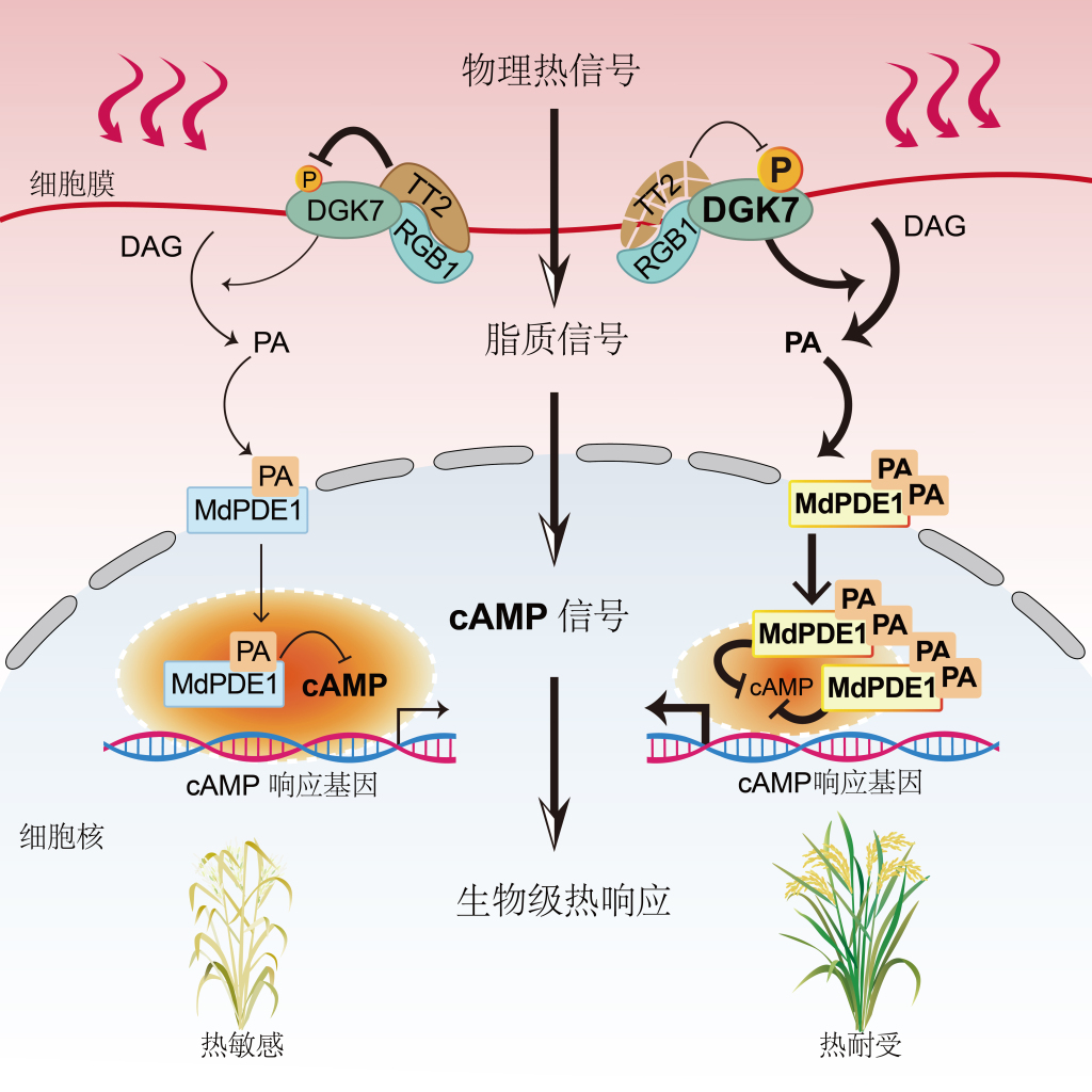 研究团队经过多年努力,成功鉴定到水稻中两个关键调控因子——DGK7(二酰甘油激酶)和MdPDE1(磷酸二酯酶)。它们像一套精密协作的“警报系统” ,将高温物理信号一步步转化为细胞能够理解的“生物指令”,完成一场从细胞边界到细胞核的“传讯”。该发现系统连接了从细胞膜脂质重塑到核内信号级联的完整过程,解决了领域内长期存在的难题。