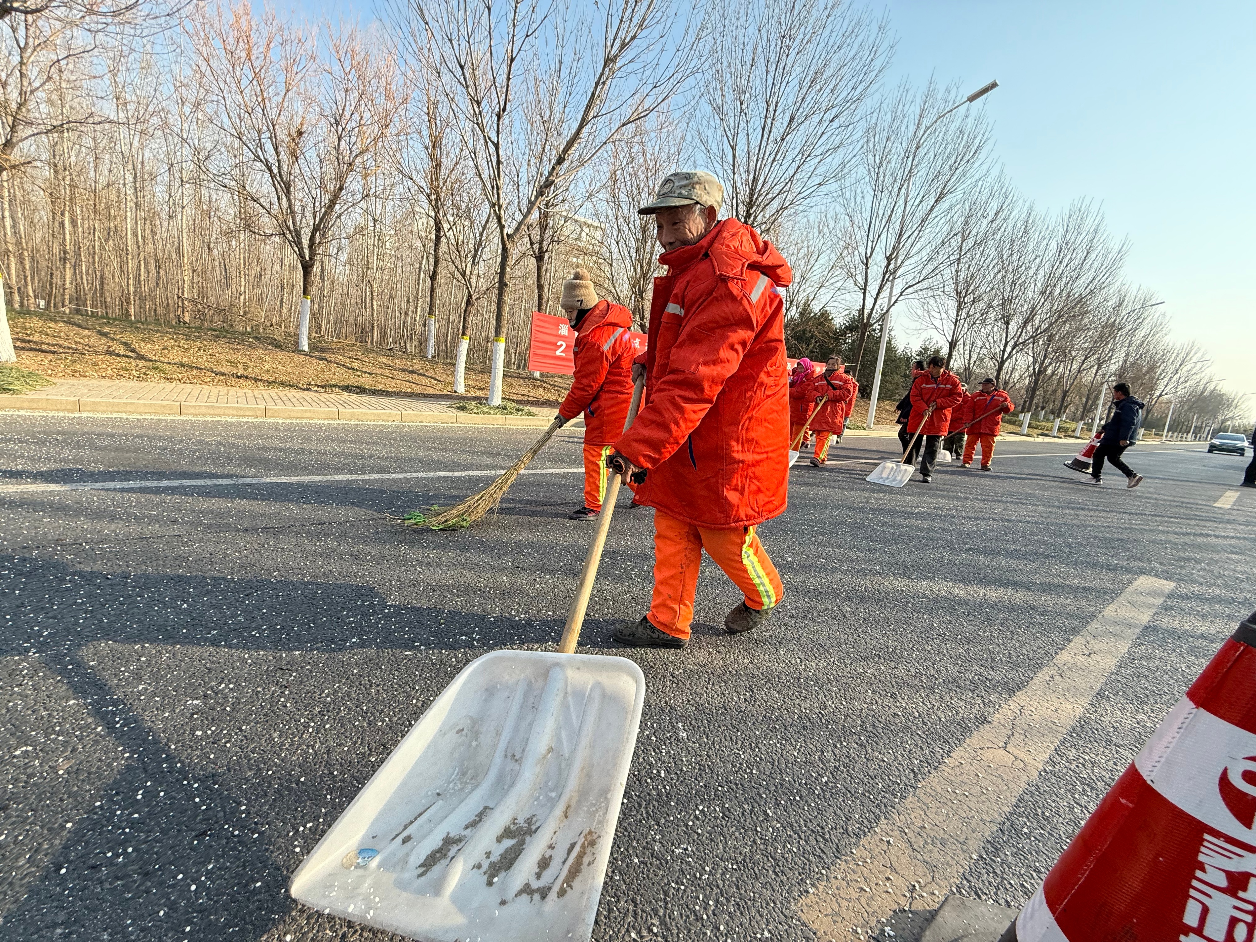1点40分,广州路里程之光西门南侧空地,来自山东泰和城建发展有限公司的参演人员已集结待命。大型撒布机、雪滚等除雪设备整齐排列,职工身着泰和城建冬季棉服,环卫工穿专用环卫棉服,全员配安全帽与反光标识。安全保障组在路段两端设警示标识,划定作业区域,现场秩序井然。