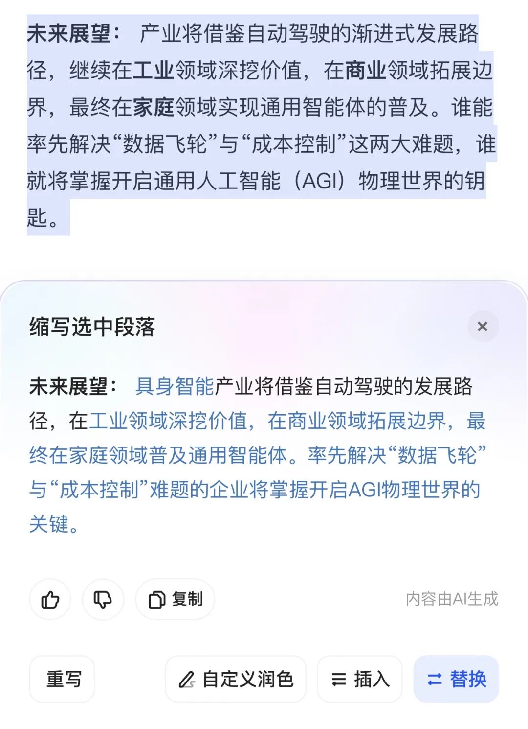 缩写能力也测一下,选中一段文字,让AI自动压缩段落内容: