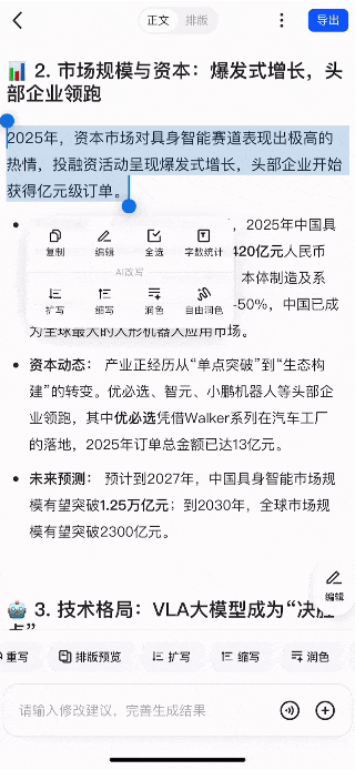可以看到,千问会围绕“具身智能”从核心观点、政策与战略、资本与市场、技术格局等维度拆开分析。