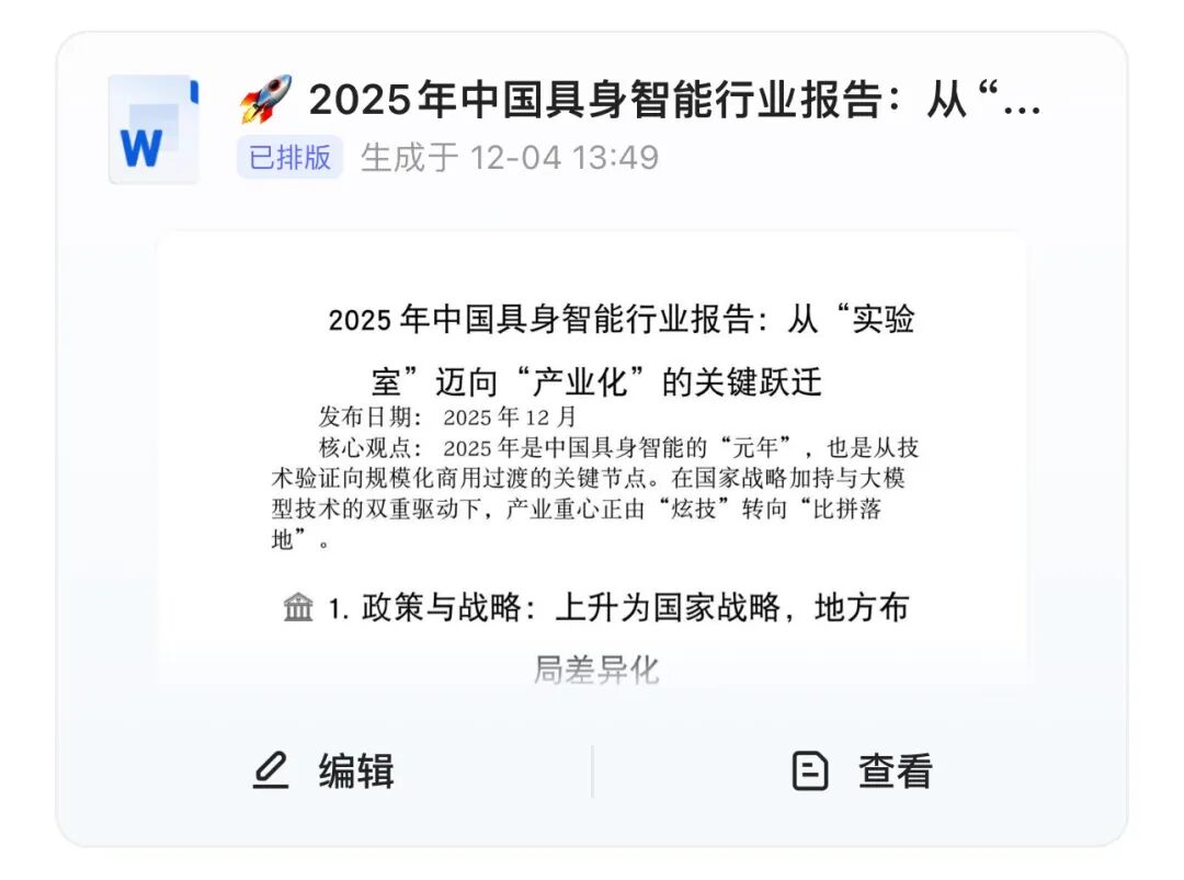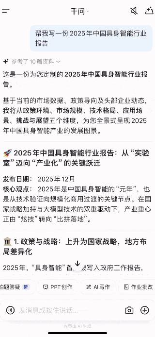 咱们再来举个实际的例子,这回让千问帮我们生成一份《2025中国具身智能行业报告》,这次我选择通过一句话指令来发送需求: