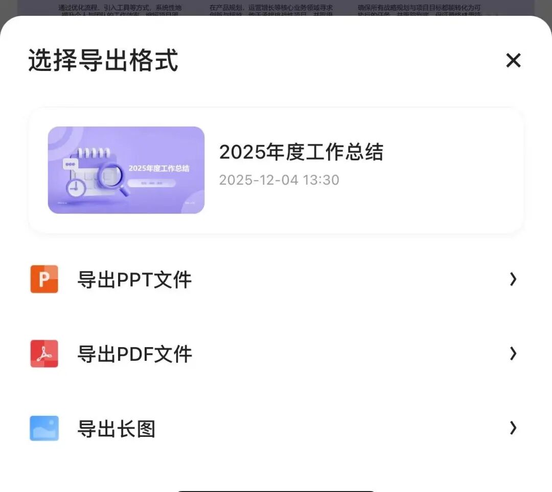 导出方式也很简单, PPT、PDF、长图 三种格式随选,不用再去别的工具转格式,手机上一键就完事儿。