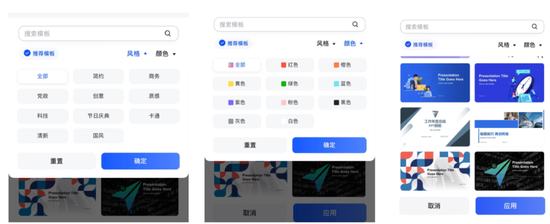 此外,PPT美观程度也是我们很care的点,现在我们在千问中可以直接更换PPT 模板款式 ,还支持选择模板 风格 和 颜色 :