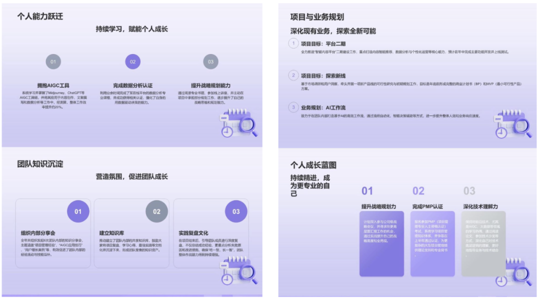 但是我们平时做PPT时花费最长的时间不是把文字粘贴到PPT,而是后续的 排版美化 步骤,为了更直观看看千问的排版水平,我随机抽了两页出来给大家瞄一眼: