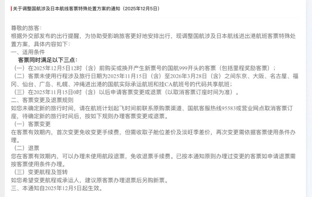 中国国际航空12月5日在官网通知中明确,客票同时满足以下三点:(一)在2025年12月5日12时(含)前购买或换开产生新票号的国航999开头的客票(包括里程奖励客票);(二)客票未使用行程涉及旅行日期为2025年11月15日(含)至2026年3月28日(含)之间东京、大阪、名古屋、福冈、仙台、广岛、札幌、冲绳进出港的国航实际承运航班和挂CA航班号的代码共享航班;(三)在2025年11月15日0时(含)以后申请客票变更或退票(以取消客票订座时间为准)。在客票有效期内,首次变更免收变更手续费,但需收取子舱位差价及淡旺季差价,再次变更需依据客票使用条件办理。在客票有效期内,乘客可以办理未使用航段退票,免收退票手续费。