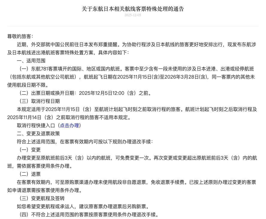 12月5日,中国东方航空也在官网发布通知,适用范围在东航781客票填开的国际、地区或国内航班。客票中至少含有一段未使用的涉及日本进港、出港或经停航班(包括东航或其他航空公司航班),航班起飞日期在2025年11月15日(含)至2026年3月28日(含),同一客票内的其他未使用航段日期不限。出票日期或换开日期在2025年12月5日12:00(含)之前。规定适用于2025年11月15日(含)至航班计划起飞时刻之前取消行程的旅客。符合上述适用范围,在客票有效期内可按规则办理退改手续。办理变更至原航班前后3天(含)以内的航班,可免费变更一次。再次变更或变更超出原航班前后3天(含)内的航班,需依据客票使用条件办理。在客票有效期内,可至原购票渠道办理未使用航段非自愿退票,免收退票手续费。