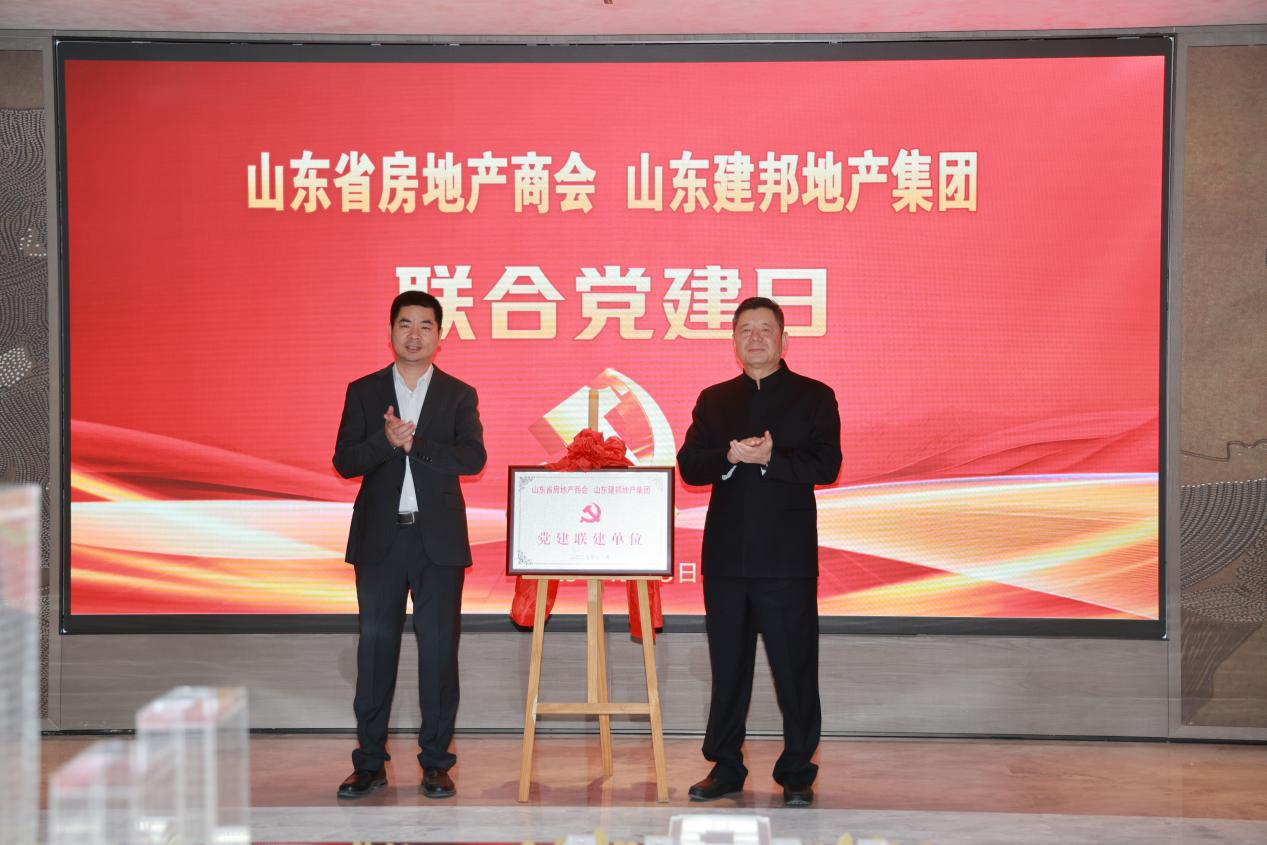 活动最后,山东省房地产商会党支部书记杨承林与山东中投建邦置业有限公司总经理苟建科共同为山东房地产商会和山东建邦地产集团“党建联建单位”揭牌。