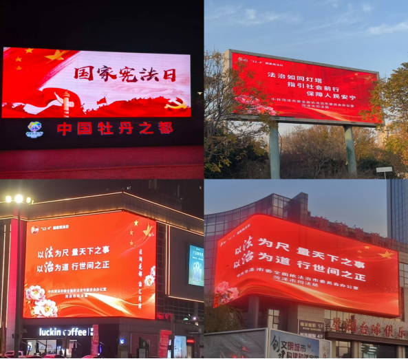 创新形式更接地气,菏泽市委依法治市办、市司法局组织“党政主要负责人述法”专题访谈电视展播活动,以“关键少数”示范引领。同步启动 “亮屏”宣传行动,菏泽城区地标建筑及各大公共场所的户外 LED 显示屏循环播放宪法宣传主题标语,以醒目直观的方式营造浓厚宣传氛围;组织“宪法进广播”活动,持续播报宪法知识、法治案例等宣传内容,让法治声音覆盖出行场景,实现“抬头见法、耳边闻法”,让宪法精神随声波传递到千家万户。