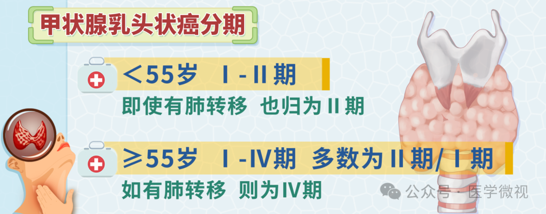 甲状腺乳头状癌是最常见的甲状腺癌类型,预后非常好,跟年龄有关系。小于55岁的患者几乎都是早期,尽管发生肺转移了,也是二期,早期一般都能治好。大于55岁的患者,绝大部分是二期或一期,只有发生肺转移了,才归为四期。对于恶性度比价高,预后比较差的未分化癌,只要一发现一般就是四期。