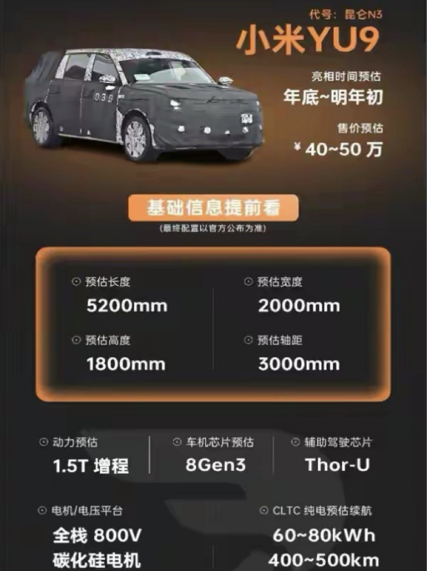 作为小米首款增程车型,YU9内部代号“昆仑”,定位中大型六/七座SUV,车长超5.2米、轴距突破3.0米,空间上直接对标理想L9、问界M9。