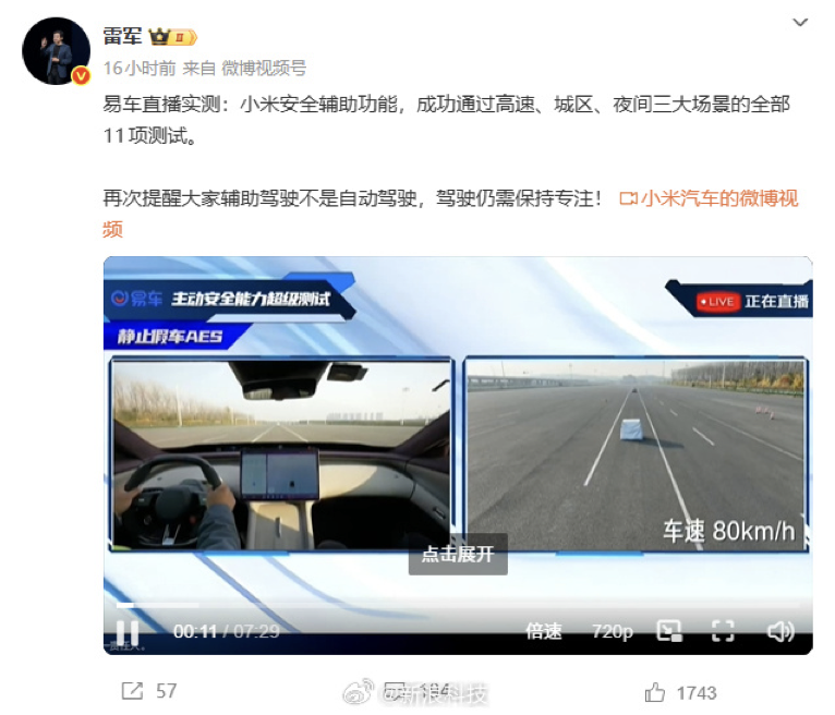 在新车信息曝光的几乎同时,小米创始人雷军亲自在微博转发了小米城市领航辅助驾驶的实测视频,为技术实力背书。此举被业内视为在华为、小鹏等强手林立的智能驾驶赛道,进行的一次高调“亮剑”,旨在强化用户对小米智驾能力的信心,为新车上市铺路。