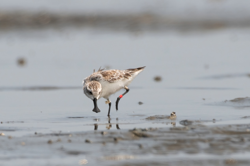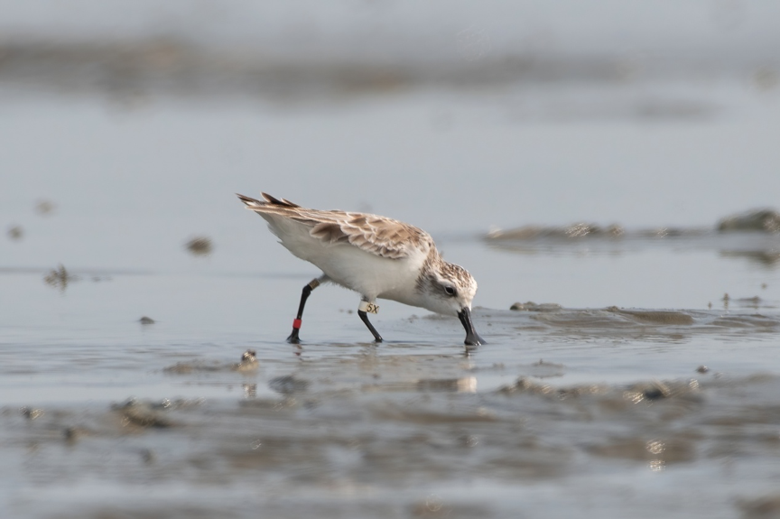 勺嘴鹬5X,白色的足旗(左)说明它是“偷蛋计划”中出生的幼鸟,5X为个体编号。2020年4月12日湛江雷州湾记录 | 小鸽最近,英国野禽与湿地基金会(WWT)发布一份报告,对过去十多年的勺嘴鹬“方舟种群计划”进行了总结[1]。