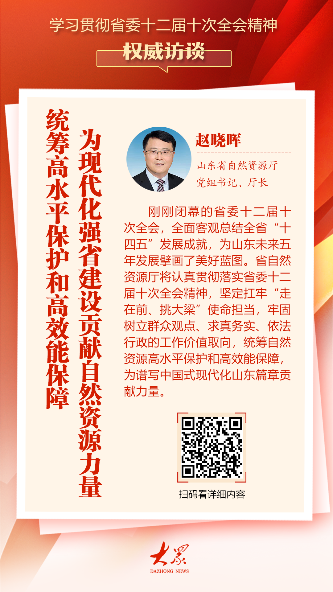 刚刚闭幕的省委十二届十次全会,全面客观总结全省“十四五”发展成就,为山东未来五年发展擘画了美好蓝图。省自然资源厅将认真贯彻落实省委十二届十次全会精神,坚定扛牢“走在前、挑大梁”使命担当,牢固树立群众观点、求真务实、依法行政的工作价值取向,统筹自然资源高水平保护和高效能保障,为谱写中国式现代化山东篇章贡献力量。