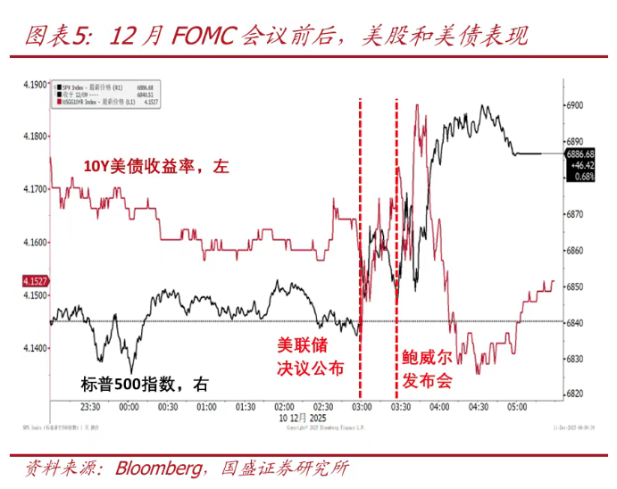 国盛证券首席经济学家熊园、国盛证券宏观分析师刘新宇今日研报指出,整体看,本次会议的基调中性略偏鸽,美联储对就业的表述进一步弱化,并暗示将重启扩表,这些内容偏鸽;但上调经济预测,同时点阵图仍维持2026年仅降息1次,鲍威尔也表示可以等待更多数据再做决策,反映出美联储对进一步降息仍偏谨慎。