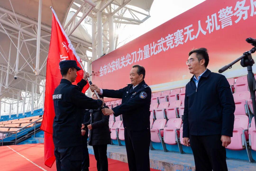 开幕式上,市公安局领导、一级高级警长梁龙雨向市公安局特巡警支队警航大队授旗、向警务协作“飞手”颁发聘书。
