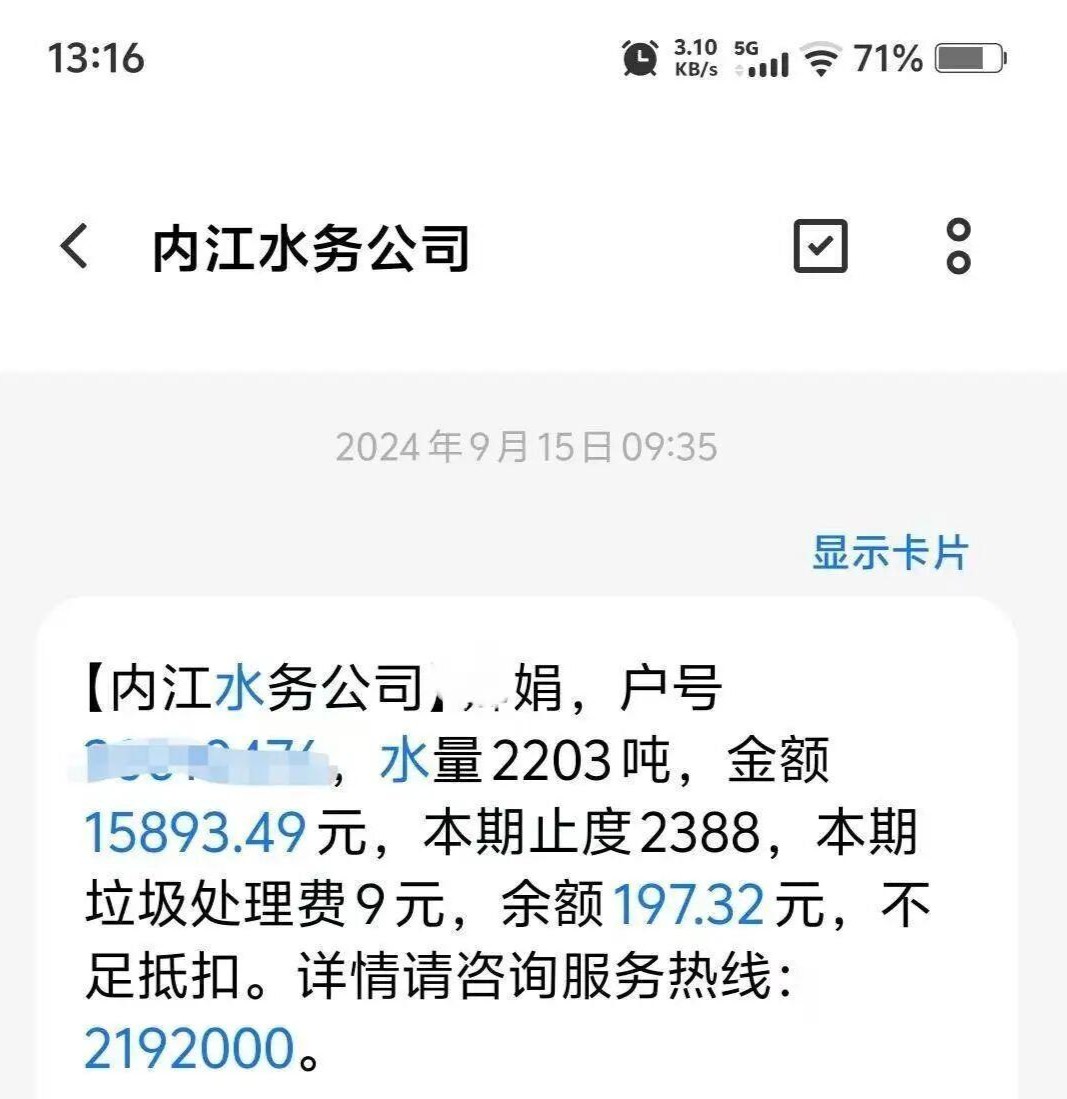 然而2024年9月15日,李娟收到的短信通知为:水量2203吨,金额15893.49元。一看这价格,她吓了一大跳。