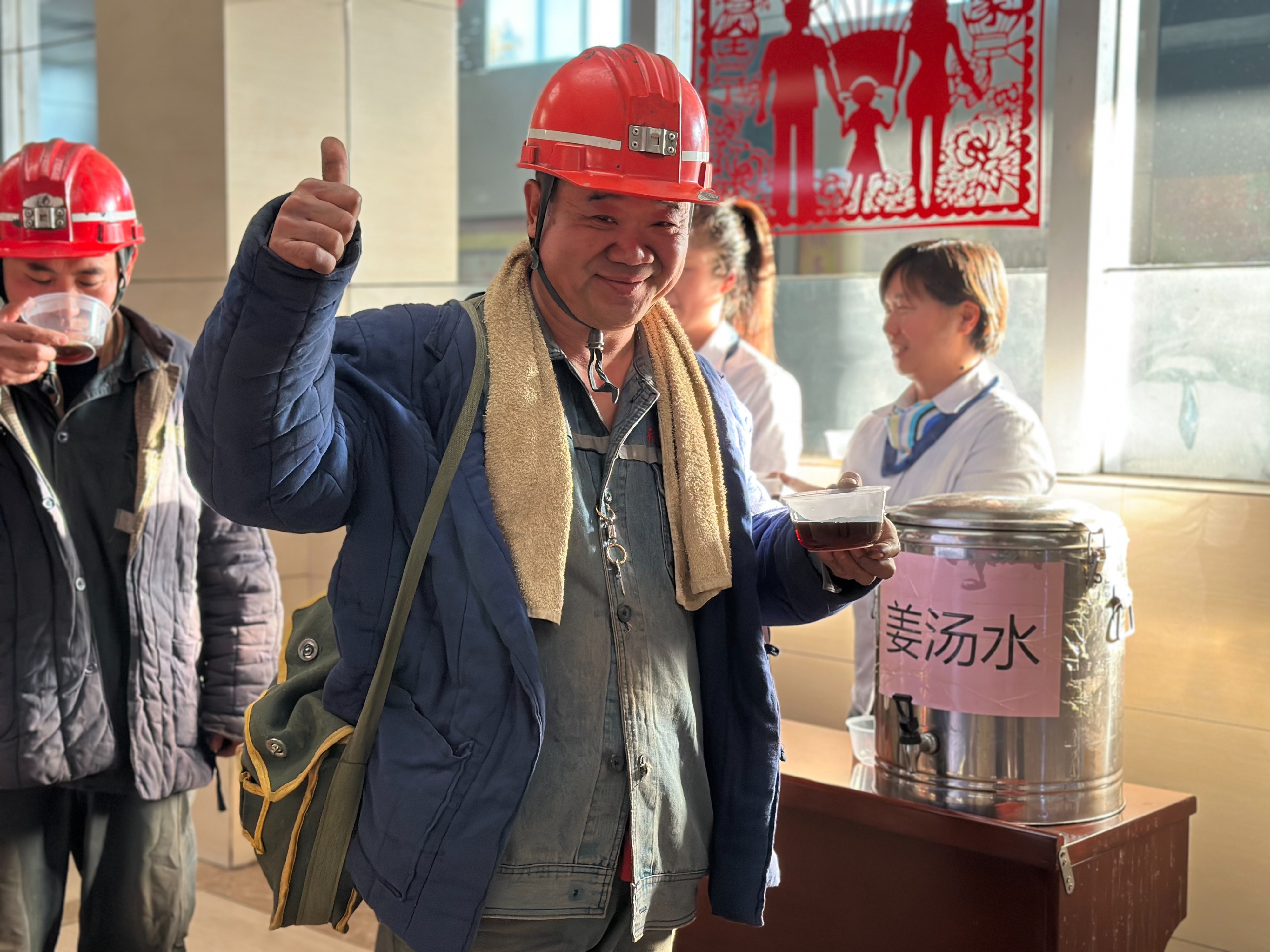 “师傅,辛苦啦!喝碗姜汤驱驱寒。”清晨的井口服务站,女工协管员们早早守候在此,将一杯杯精心熬制的姜汤递到上下井职工手中。热气升腾间,笑容在职工脸上绽放。