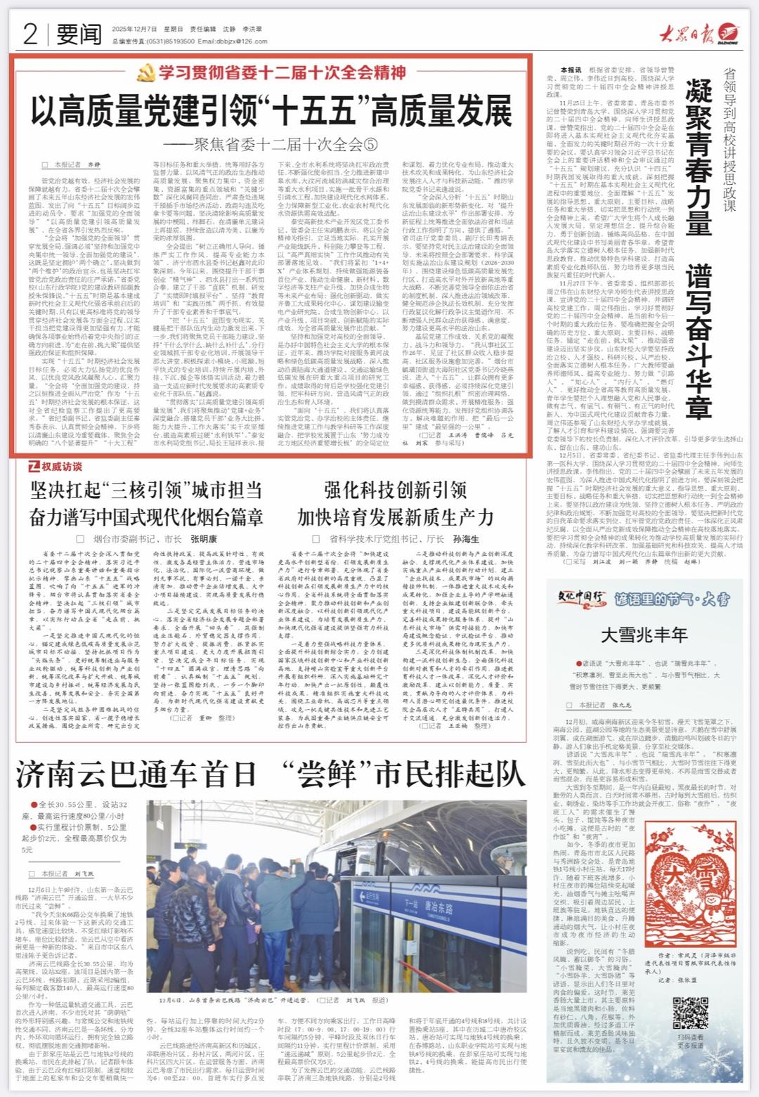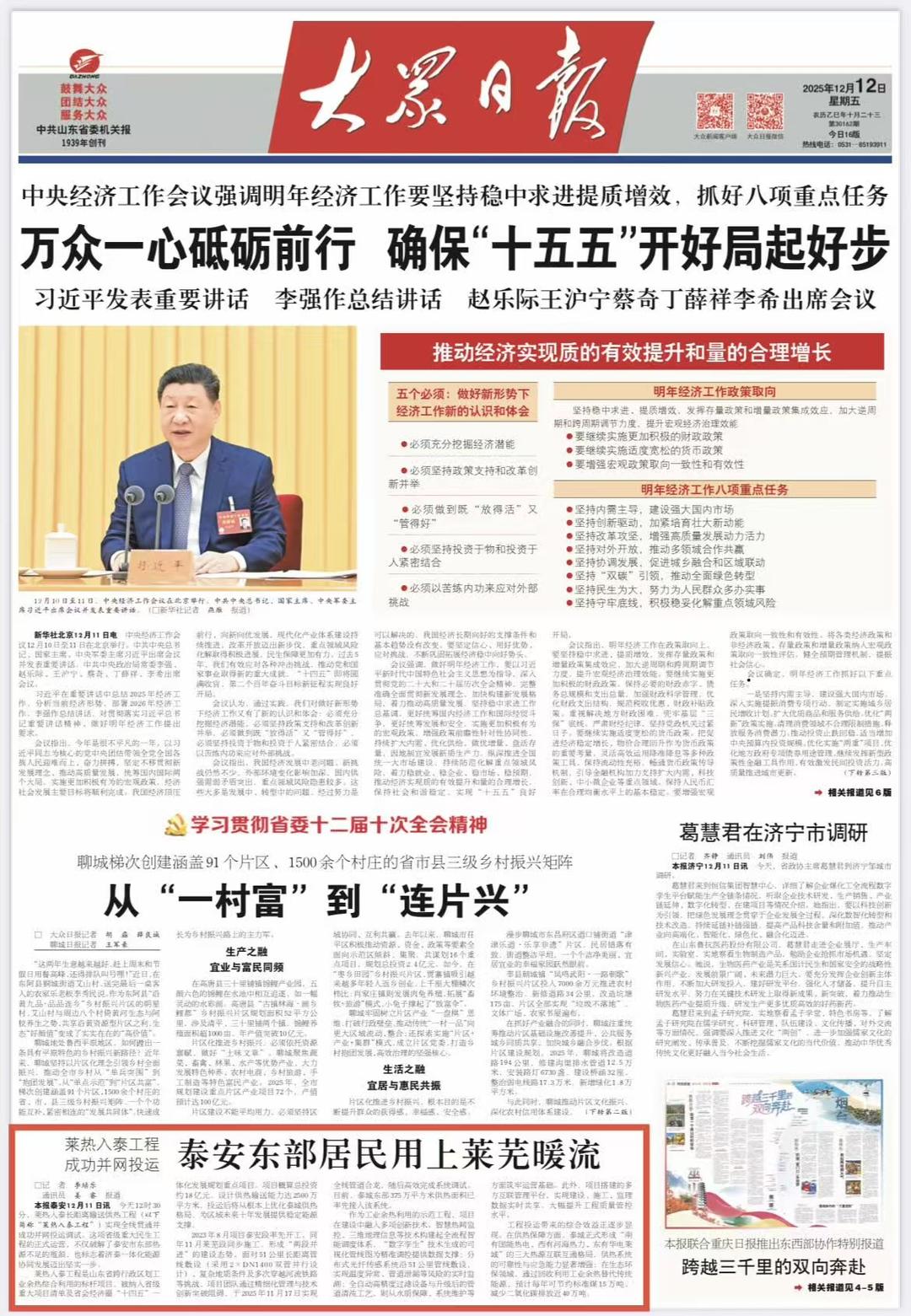 12月12日,头版刊发《泰安东部居民用上莱芜暖流》,报道省级重大民生工程莱热入泰工程成功并网投运,标志着济泰一体化能源协同发展迈出坚实一步。详情请点击这里—