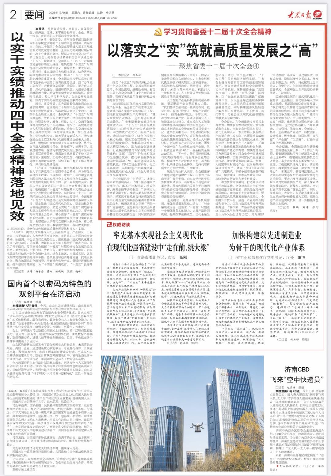 12月7日,2版要闻刊发《以高质量党建引领“十五五”高质量发展》,泰安高新技术产业开发区党工委书记、管委会主任宋鸿鹏表示,将以全会精神为指引,立足当地实际,扎实开展产业能级跃升、科创能力攀登等工程,以“高严真细实快”工作作风推动有关部署落地见效。