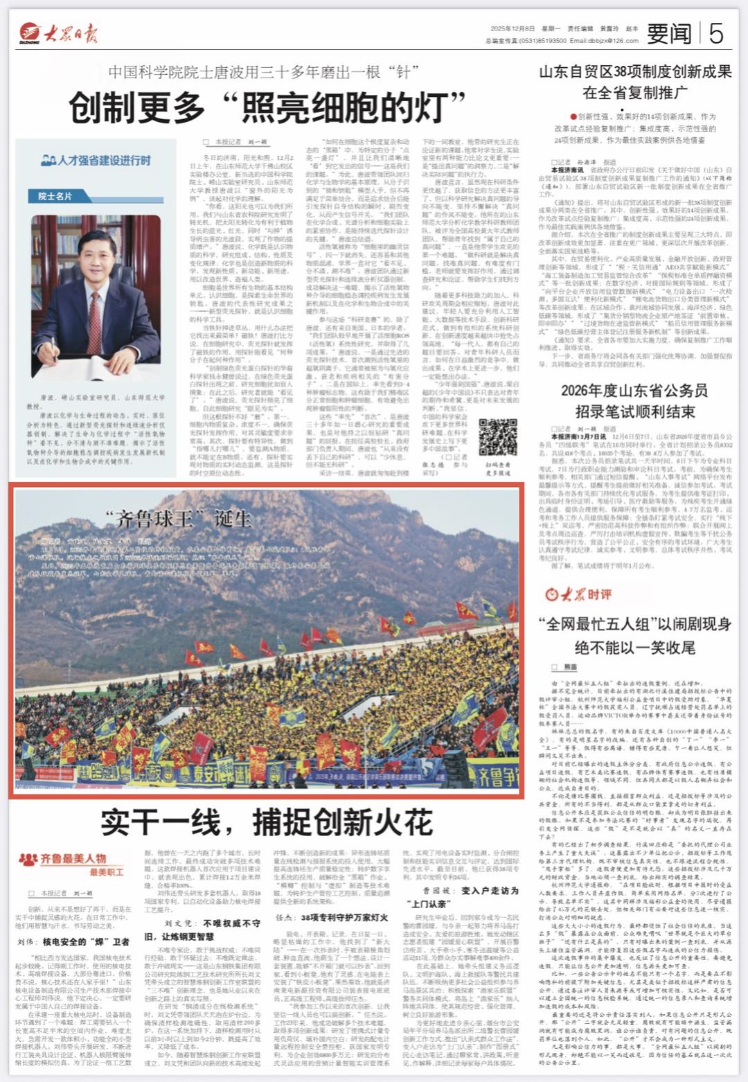 12月8日,5版刊发图片新闻《“齐鲁球王”诞生》,报道2025年首届山东省足球俱乐部联赛总决赛暨齐鲁球王争霸赛,泰安泰山城建队收获年度总冠军。详情请点击这里—