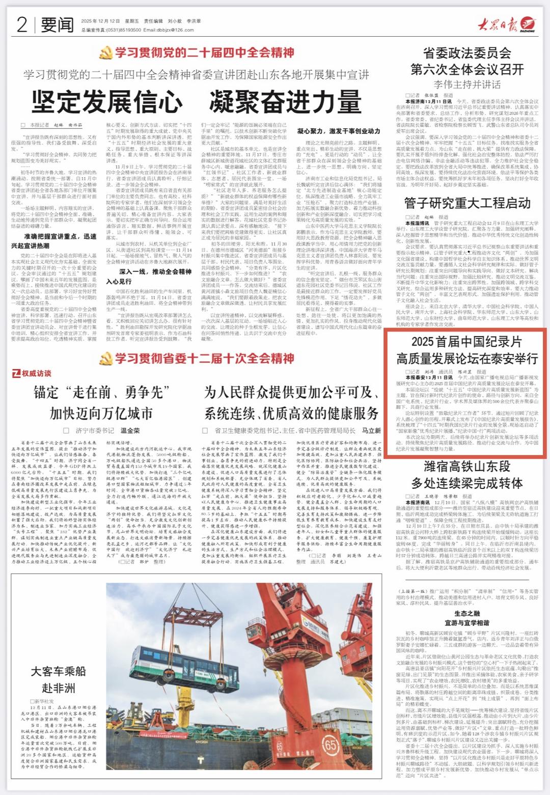 12月12日,2版要闻刊发《2025首届中国纪录片高质量发展论坛在泰安举行》,报道2025首届中国纪录片高质量发展论坛在泰安开幕,500余位代表齐聚泰山脚下,共商行业发展。详情请点击这里—