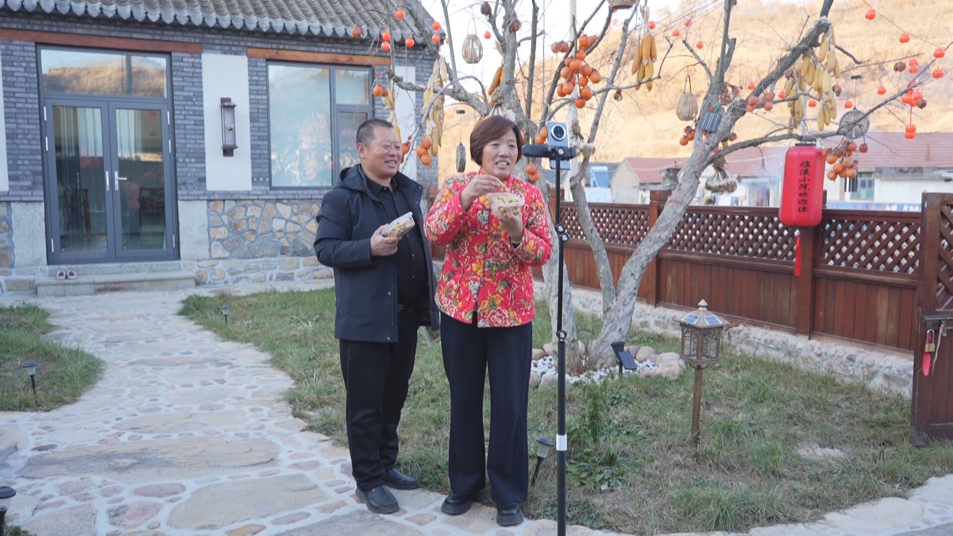 随着生活条件的逐渐改善,乔建梅夫妇也发自内心地想帮村民们一把。除了吸引有意向的村民帮他们打下手,还拍起了充满烟火气的短视频,记录乡村日常,推介特色物产,让姜家夼村逐渐走进大众视野。“我常年在这干,主要是帮他们干些收拾卫生、备备食材的活儿,不是很累,一年能挣个4到5万块钱,在这干挺快乐的,又能挣着钱还能开开心心的。” 崖子镇姜家夼村村民吴雪玉说。