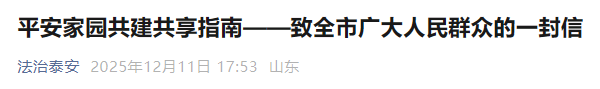 12月11日,中共泰安市委政法委员会微信公众号“法治泰安”发布《平安家园共建共享指南——致全市广大人民群众的一封信》。