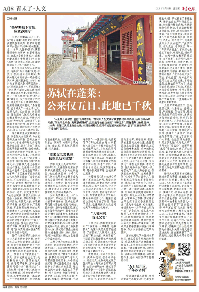 “人生到处知何似,应似飞鸿踏雪泥。”苏轼的人生充满了频繁转徙的漂泊感,他用自嘲的口吻说“问汝平生功业,黄州惠州儋州”,然而追寻他在山东的“诗和远方”,则有密州、齐州、登州。1085年,他第二次踏上齐鲁大地,来到登州赴任,在只有短短五天的任期内,留下“五日登州府,千年苏公祠”的美谈。