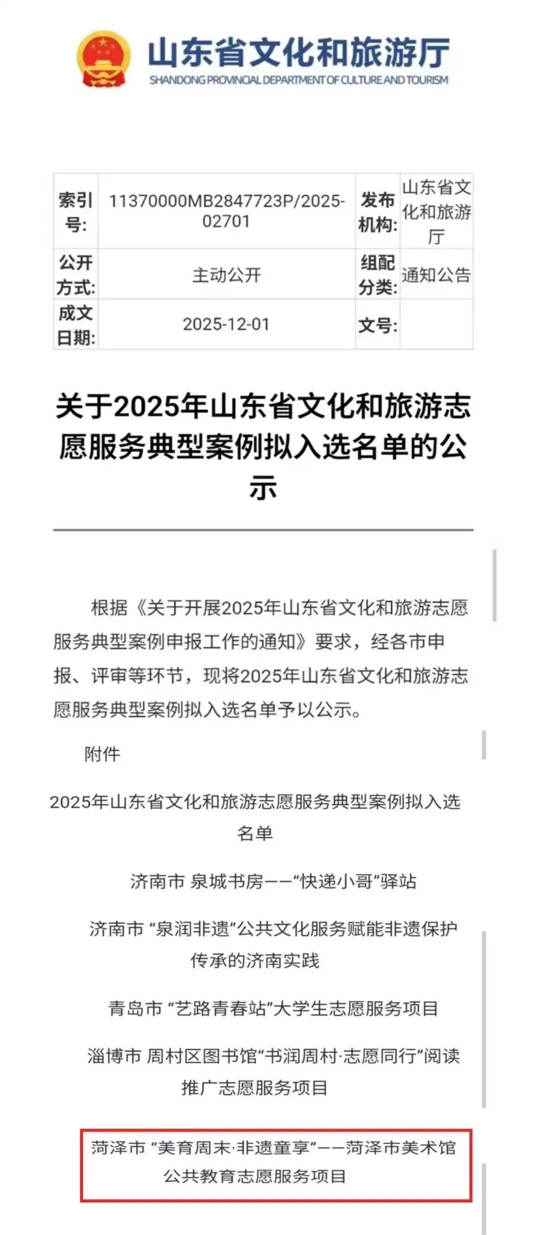 近期,由菏泽市文化和旅游局指导,菏泽市美术馆策划实施的 “美育周末·非遗童享”——公共教育志愿服务项目,入选“2025年山东省文化和旅游志愿服务典型案例”。