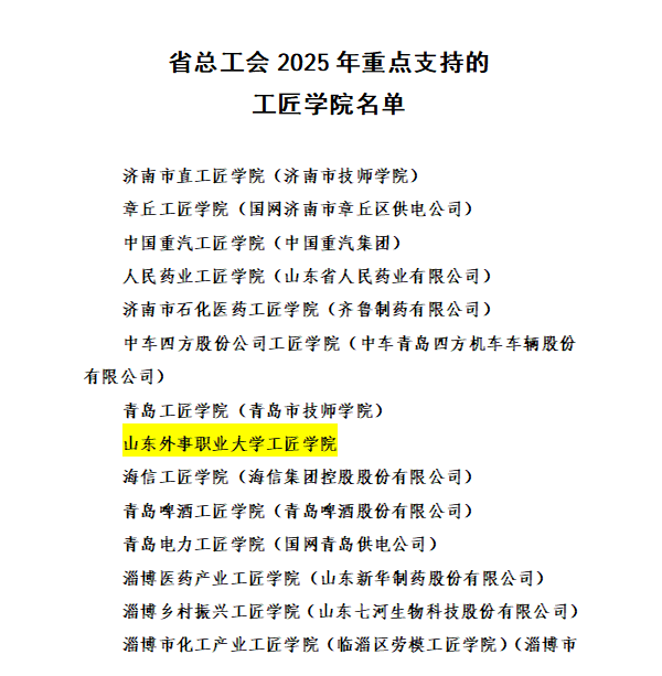 近日,山东省总工会办公室印发《关于公布省总工会2025年重点支持的工匠学院名单的通知》。经过严格综合评定,山东外事职业大学工匠学院成功入选省总工会2025年重点支持的工匠学院名单,并获得100万元配套建设资金。这标志着学校在工匠人才培养和高技能人才队伍建设方面迈上了新的台阶,获得了省级层面的充分肯定与有力支持。