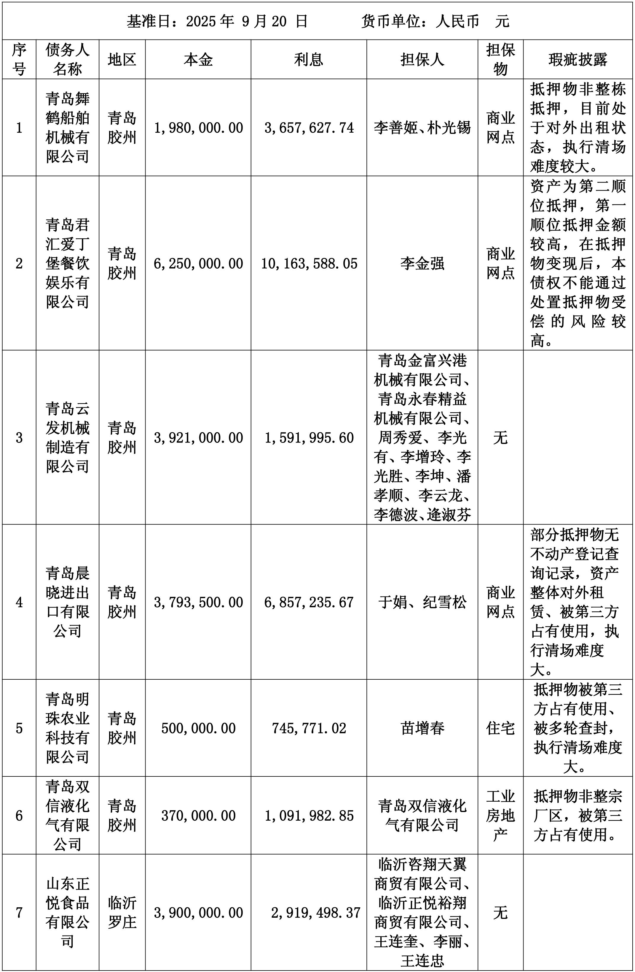 注:1.本公告清单仅列示截至基准日的债权本金、利息余额,基准日后债务人和担保人应支付的利息、违约金、相关费用等按照相关合同、生效法律文书及法律法规的规定计算。