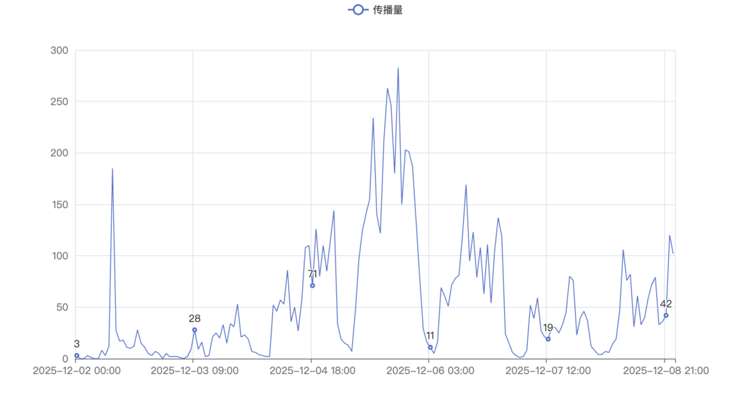 如图所示,有关2025全球智能机械与电子产品博览会的信息传播于12月5日达到最高活跃峰值,当天信息传播数量为283条,占全部信息总量的3.11%。