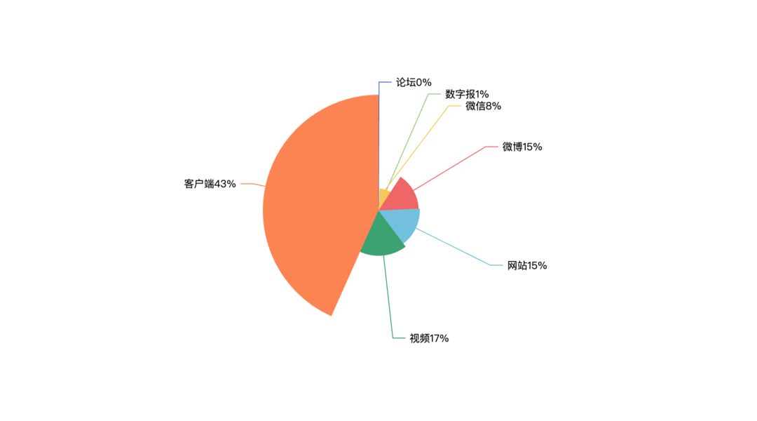 全网9089条传播信息中,来自客户端的信息有3937条,来自网站的1408条,微博1370条,微信750条,视频1539条,数字报73条,互动论坛12条。信息传播量最大的渠道是客户端。客户端和网站的信息数量占比达58.81%,说明主流媒体在2025全球智能机械与电子产品博览会的信息传播中起到了重要的推动作用。