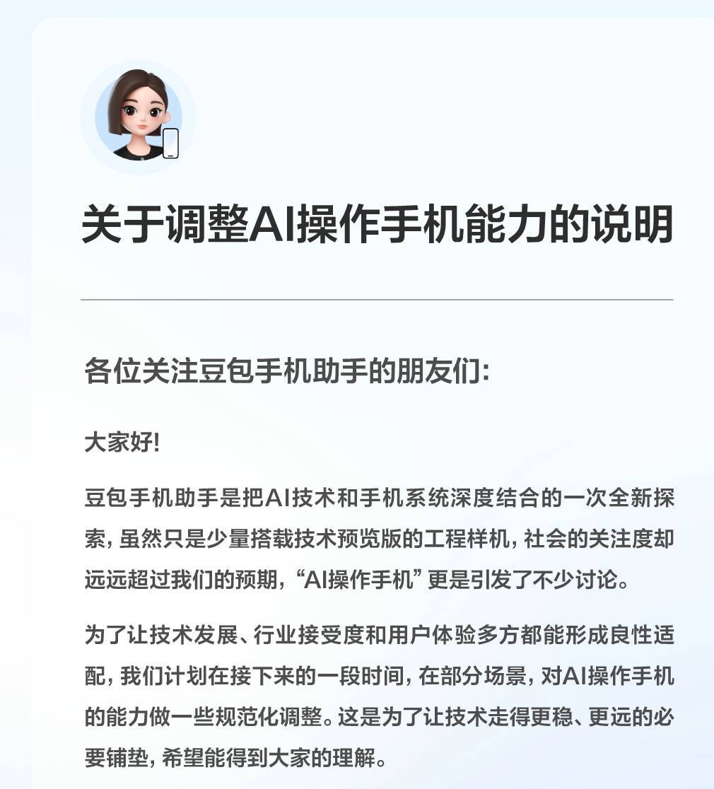 12月5日,豆包手机助手发布《关于调整AI操作手机能力的说明》,称计划在接下来的一段时间里,在部分场景中,对AI操作手机的能力做一些规范化调整,包括限制刷分、刷激励的使用场景,进一步限制金融类应用的使用(包括银行、互联网支付等),限制部分游戏类使用场景,以回应外界对产品的质疑。