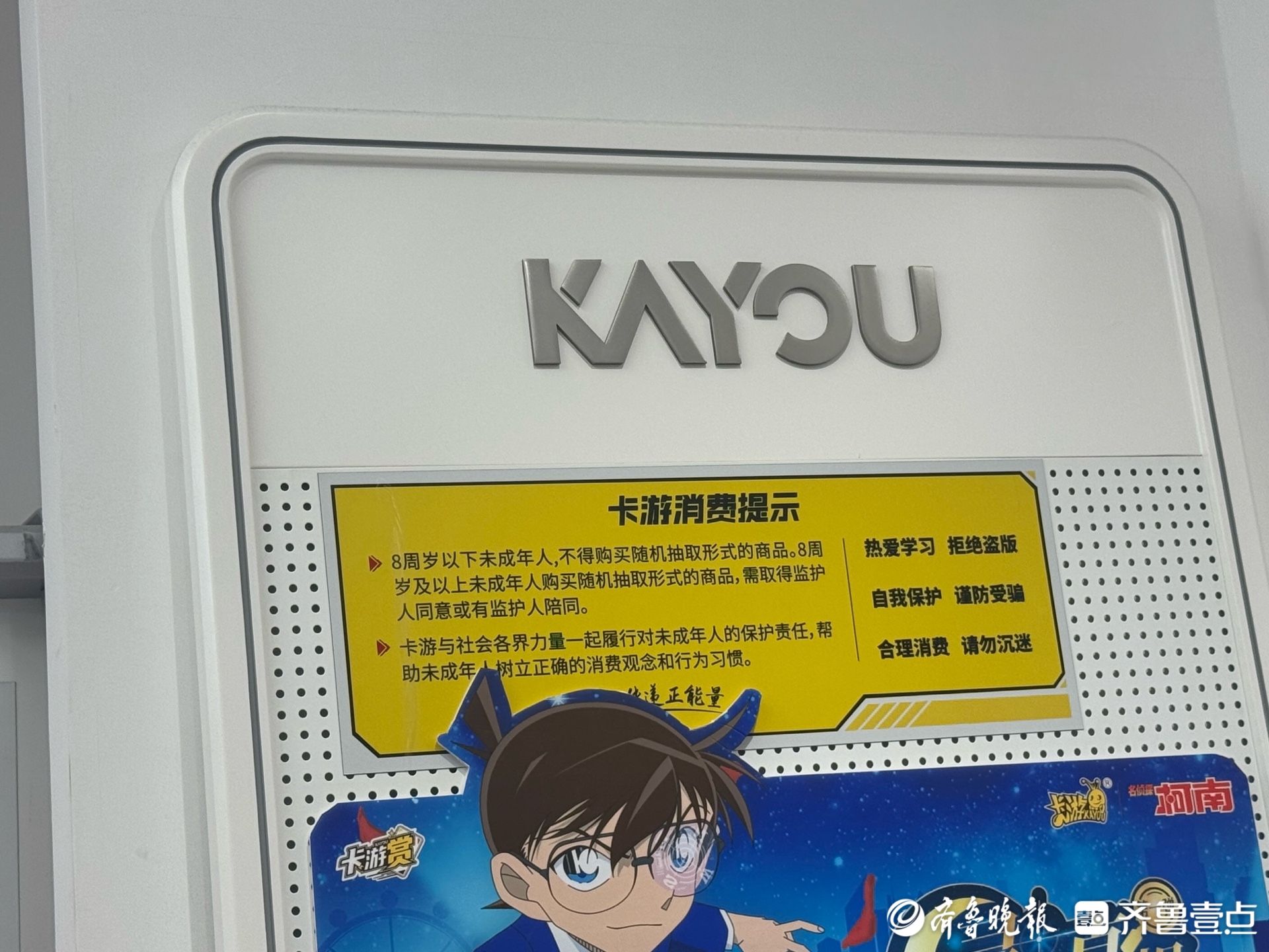 在一家动漫衍生品专卖店中,收银台处张贴着醒目的消费提示:“8周岁以下未成年人,不得购买随机抽取形式的商品;8周岁及以上未成年人购买,需经监护人同意或由监护人陪同。”